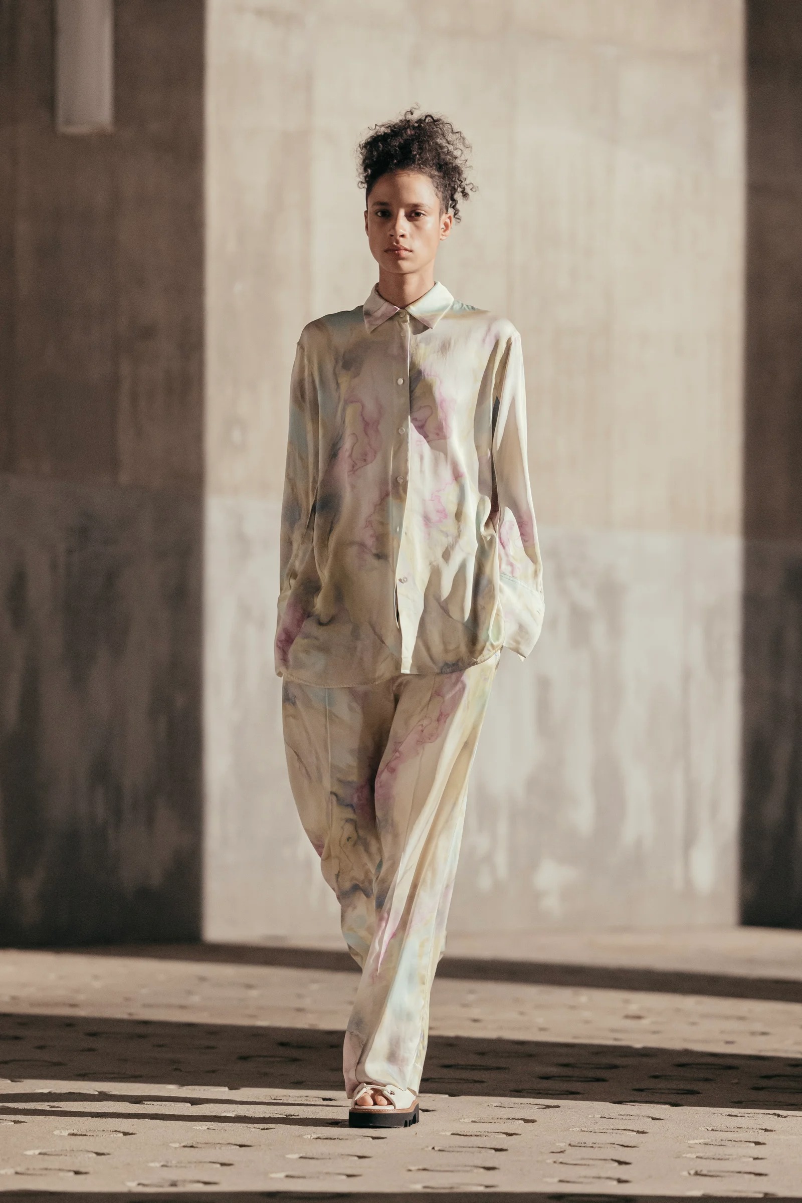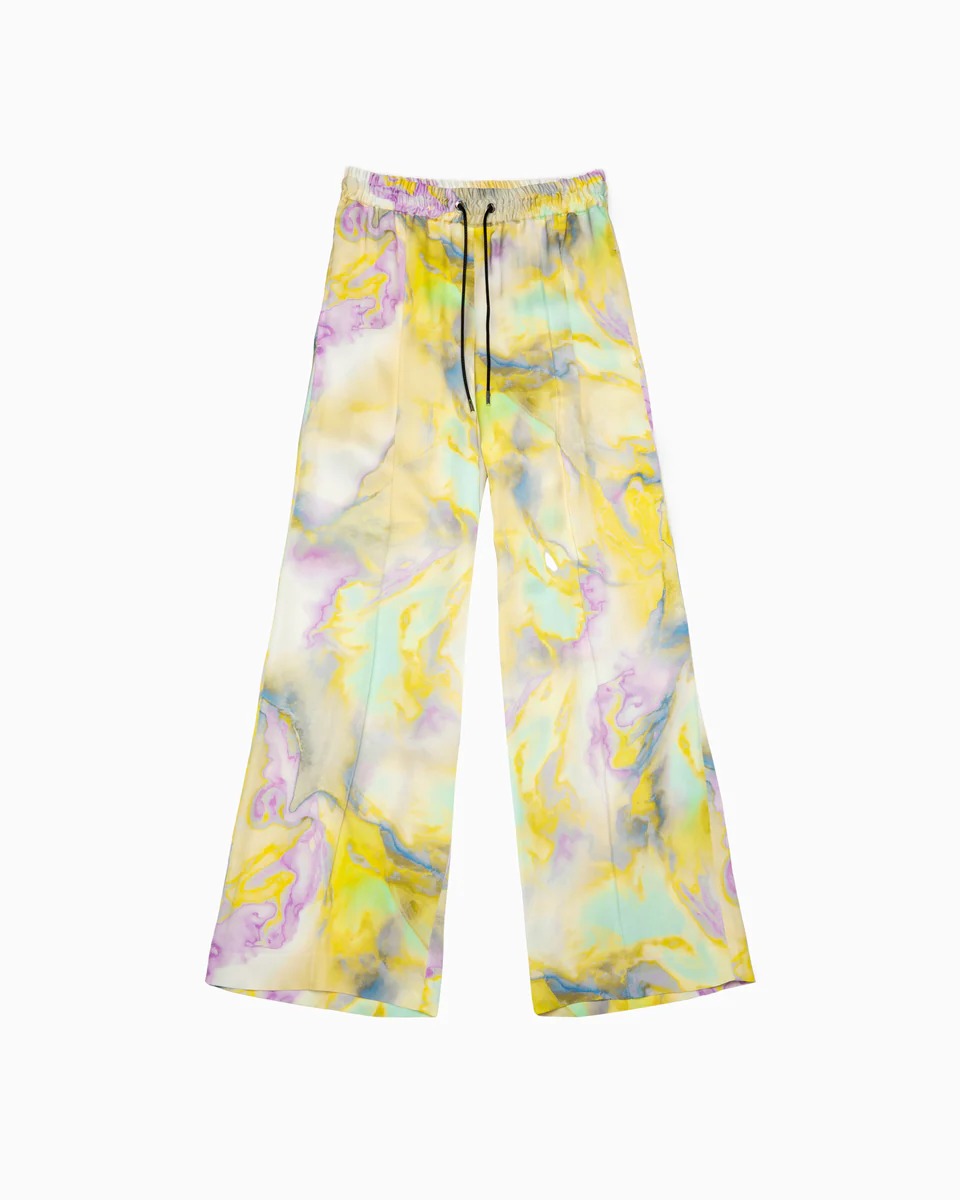 インパクト抜群!イエローベースの淡いマーブル柄は、光沢感がエレガントな印象を与えてくれる1本。柄の色を拾ったトップスと合わせて、今年はプレイフルなカラースタイリングを楽しんでみては。