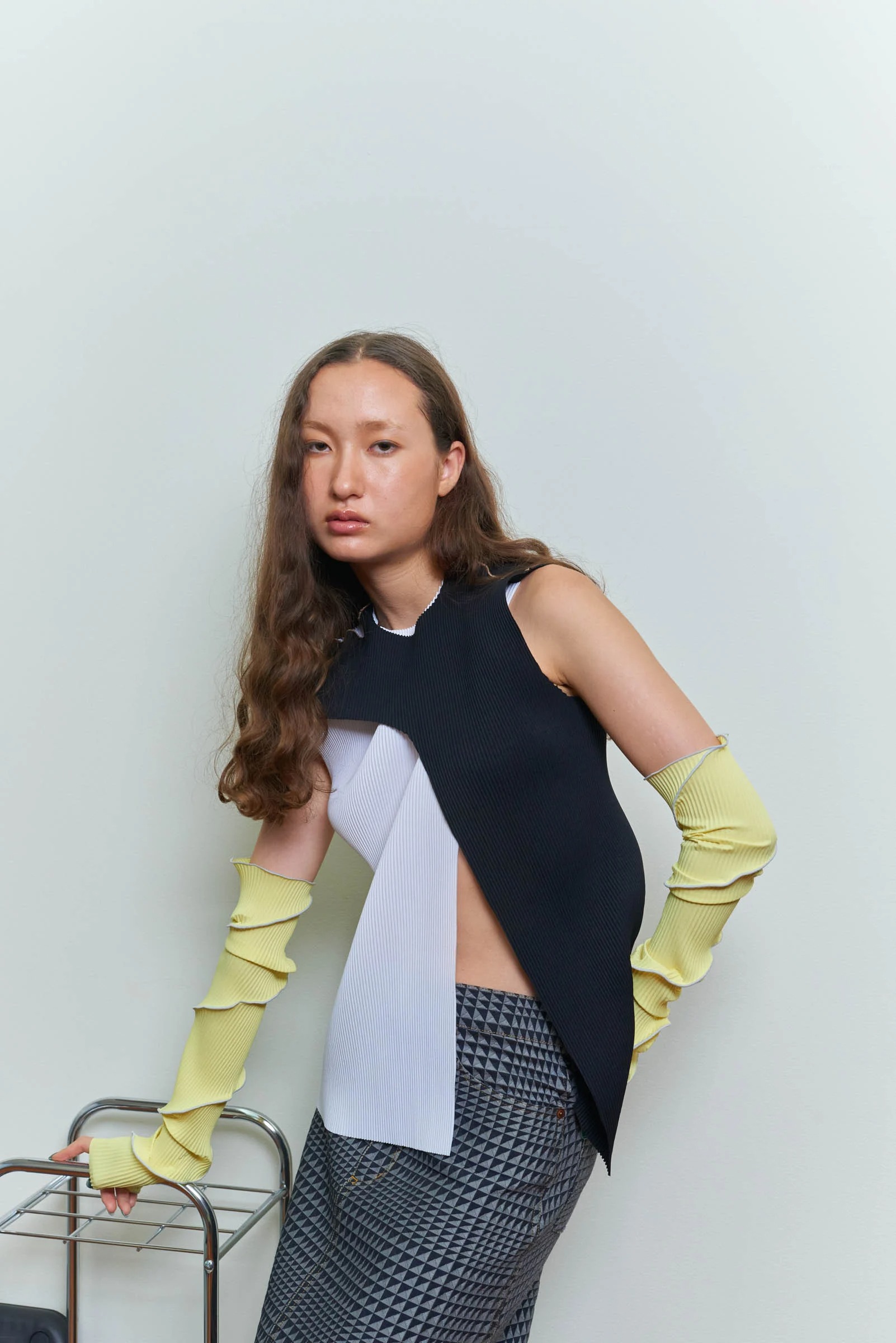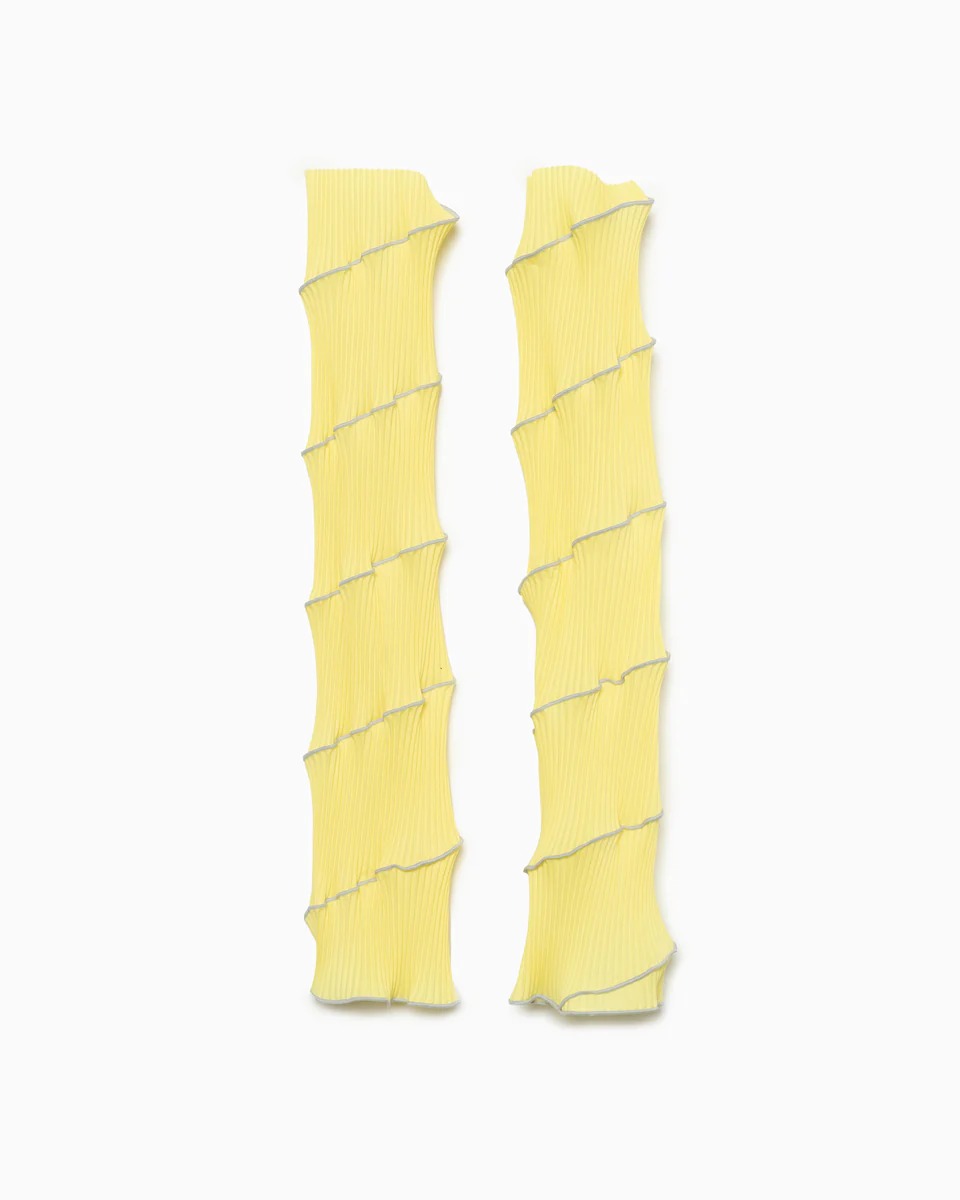 アームカバーのトレンドは今季も継続。ソフトなレモンカラーはスタイリングのアクセントにぴったり。Tシャツなどのカジュアルアイテムも、どこか品のある佇まいに昇華してくれます。