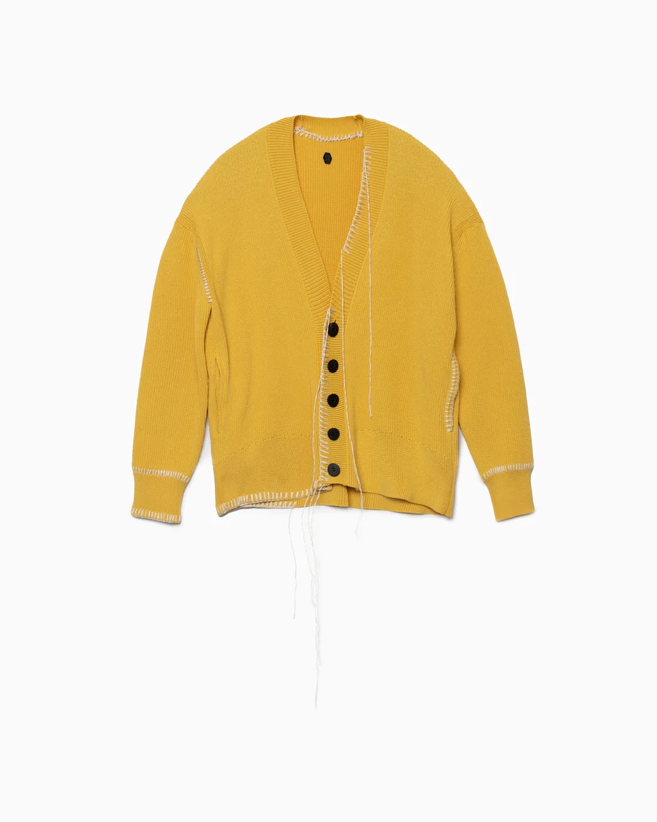 アシンメトリーに垂れたロングステッチがキャッチーなカーディガン。ヴィヴィッドな色味ですが、意外と通年で使える優れものです。ざっくりと羽織って程よいこなれ感を演出してみては。