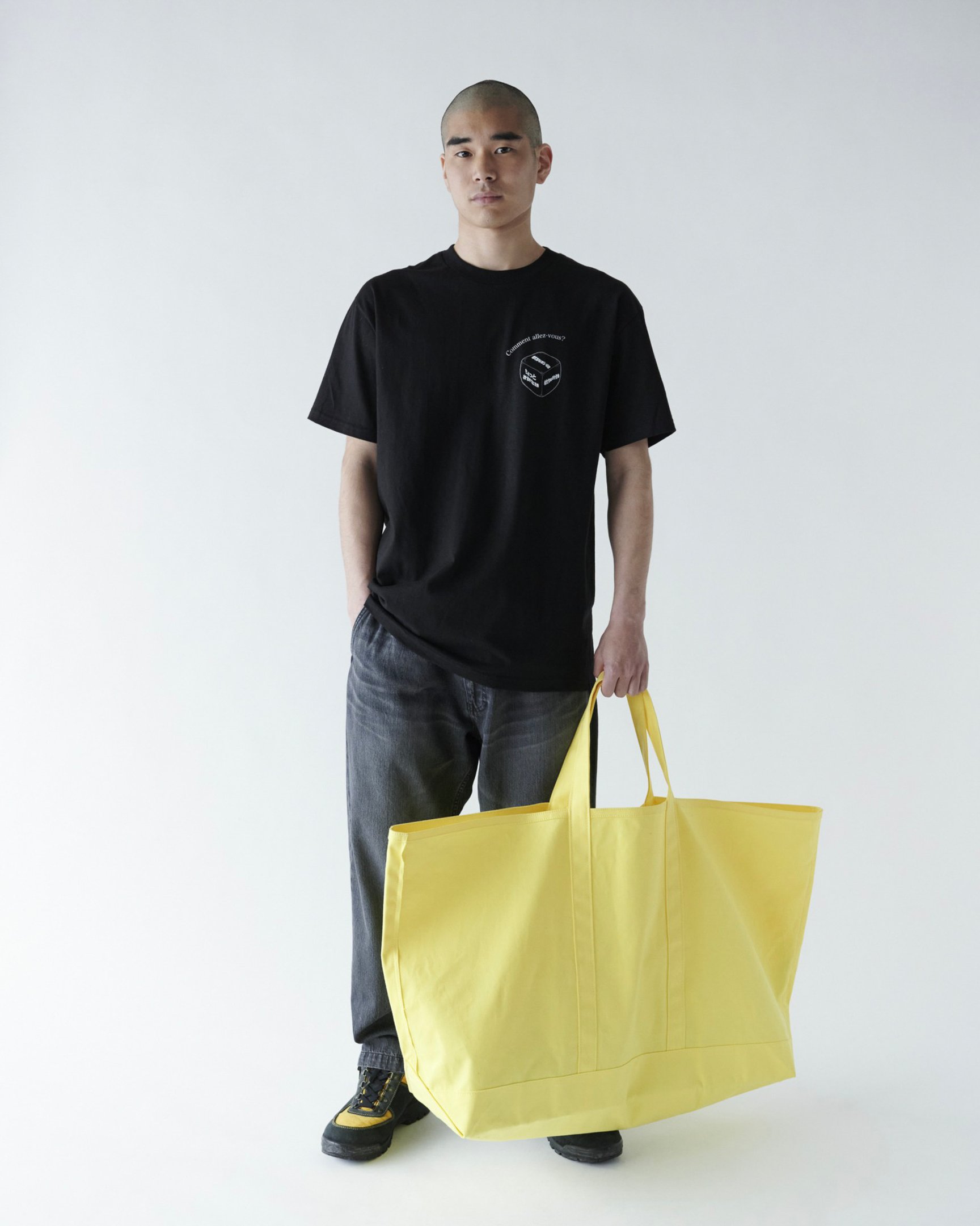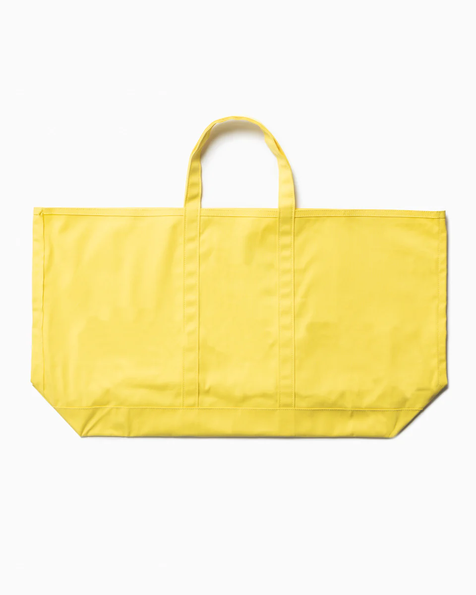 遊び心溢れる超特大サイズのキャンバストートバッグは、バッグを主役にしたスタイリングを楽しんでも良さそう。1泊2日程度の旅行ならこれ1つで十分!