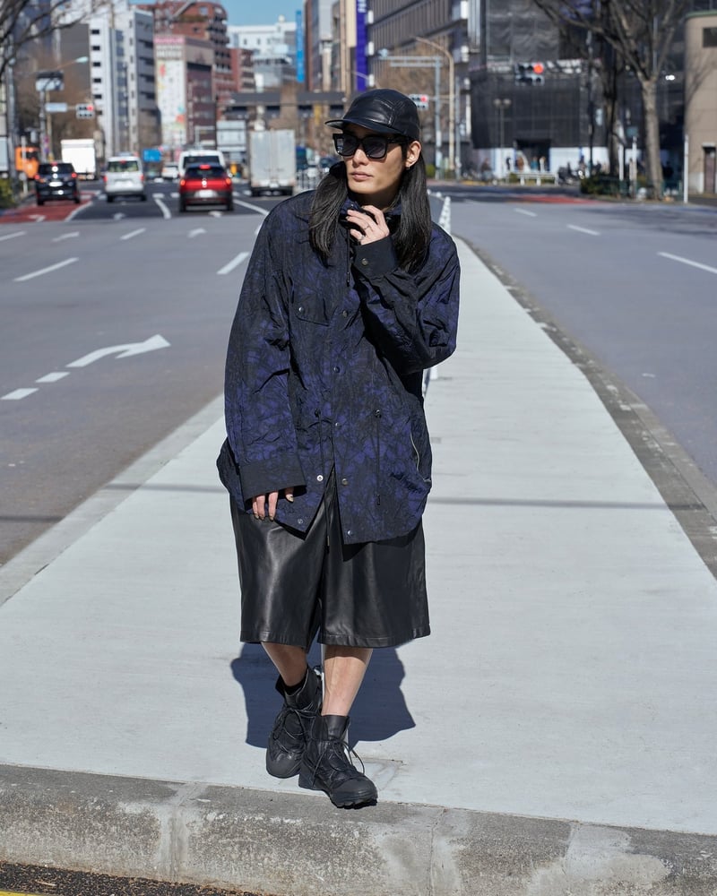 ブラックとブルーのシックな配色のタイダイ柄が目を惹くアノラックを主役に、レザーのハーフパンツやブーツ、キャップでモードに引き締めたスタイリング。ジェットキャップやワイドショーツなどストリートテイストなアイテム同士の組み合わせも、レザーでまとめることで統一感が生まれ上品な印象に。象徴的な柄のブルゾンを際立たせた、引き算が光る着こなし。
