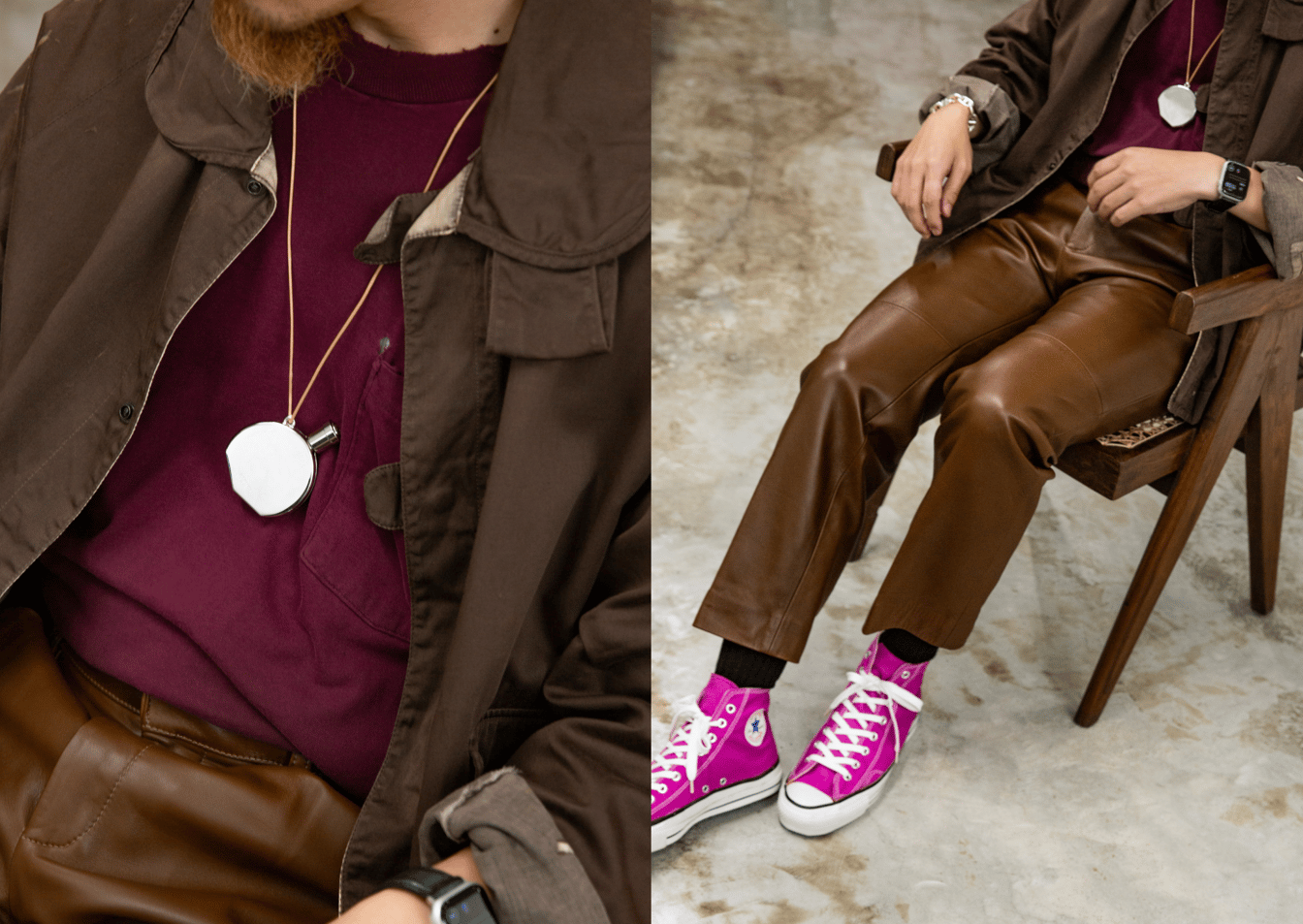 エルメスのブレスレットとペンダントに、「ロエベ(LOEWE)」のレザーパンツ、足元はラズベリーカラーの「コンバース(CONVERSE)」で外して。