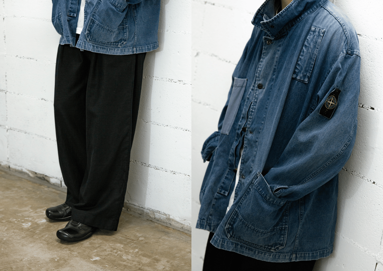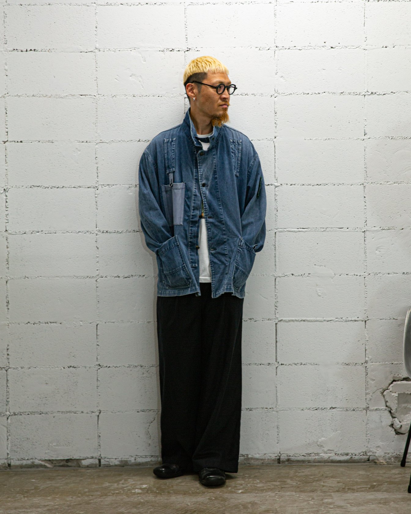 デニムのストーンアイランドのジャケットにワイドな「アンセルム(ANCELLM)」のスラックスを合わせた。