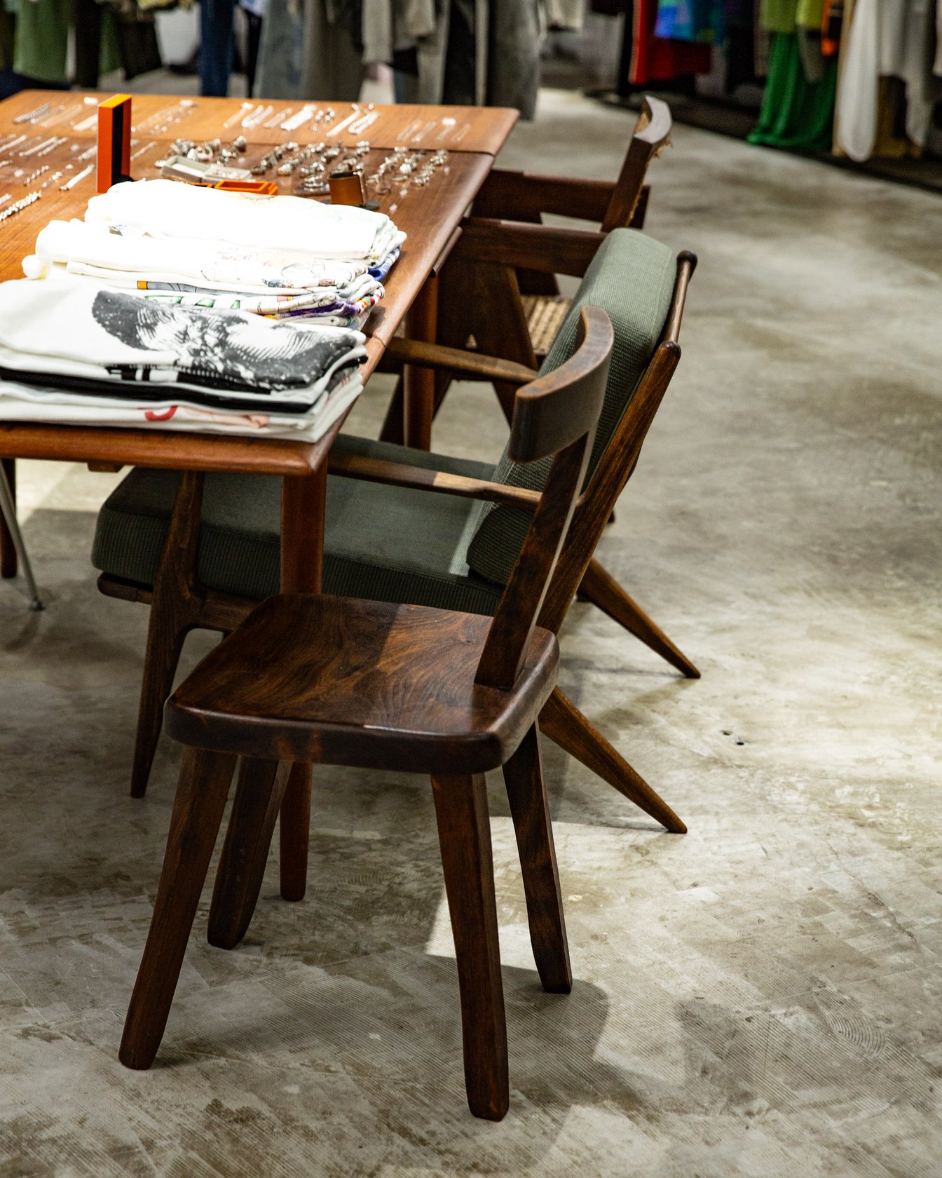 ジュエリーとTシャツを陳列するテーブルの脇には、杉本さんの椅子コレクションが。