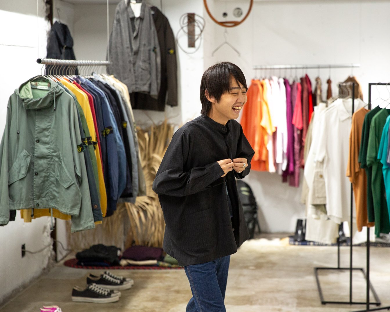オーナーの杉本さん。店頭には古着だけでなく、アーティストの一点物の作品やセレクトブランドのアイテムも。