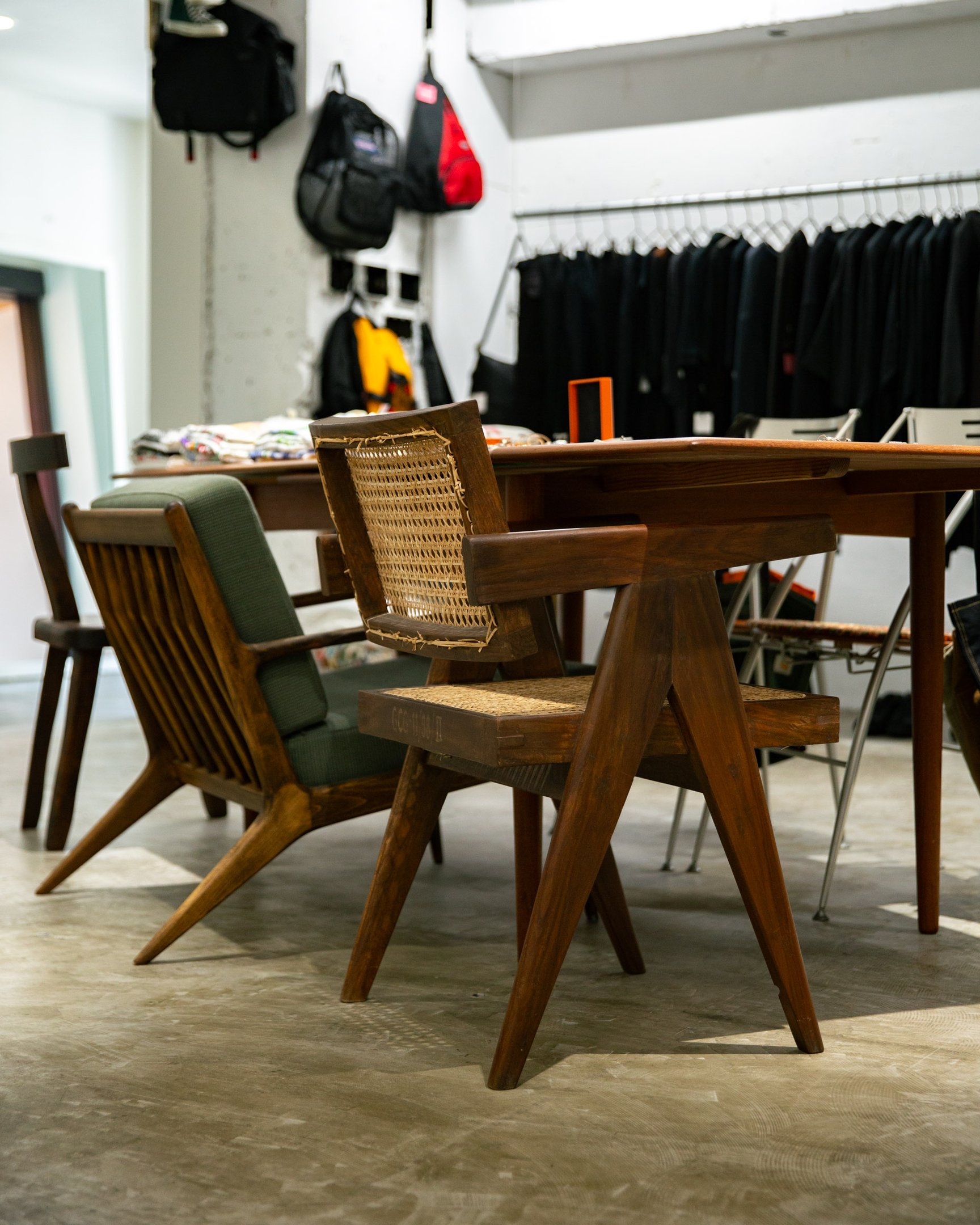 今回訪れたのは、自由が丘駅南口を学園通り方面へ歩くこと約5分、住宅街の路面に位置する古着屋「エロティック(EROTIC)」。外からは店内の様子が伺えず、なんだか怪しい雰囲気のガラス張りの外観に、ピンクの「EROTIC」の文字とミラー看板が目印だ。ガラスの反射に隠された先に一歩足を踏み入れると、クリーンで広々とした空間が広がる。広さを活かした余白を感じる店内には、所々にインテリア好きのオーナー?杉本陽介さんが集めた様々な名作椅子が並ぶ。「好きなもの」だけを集めるEROTICの店づくりに学ぶ、「好き」から始まる古着の始め方。