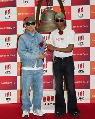東京証券取引所にて新規上場を記念した打鐘の後、抱き合うNIGO??とファレル?ウィリアムス