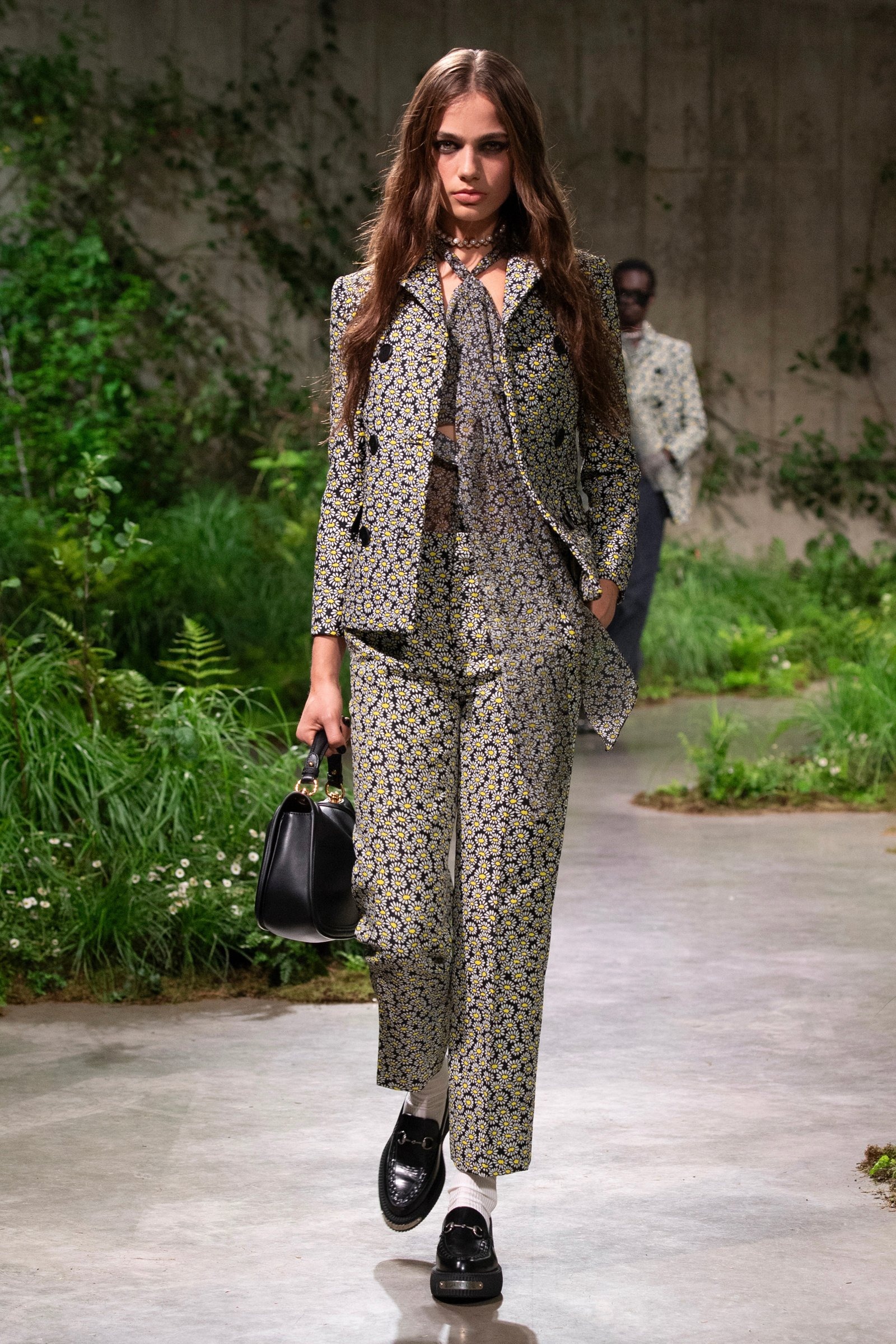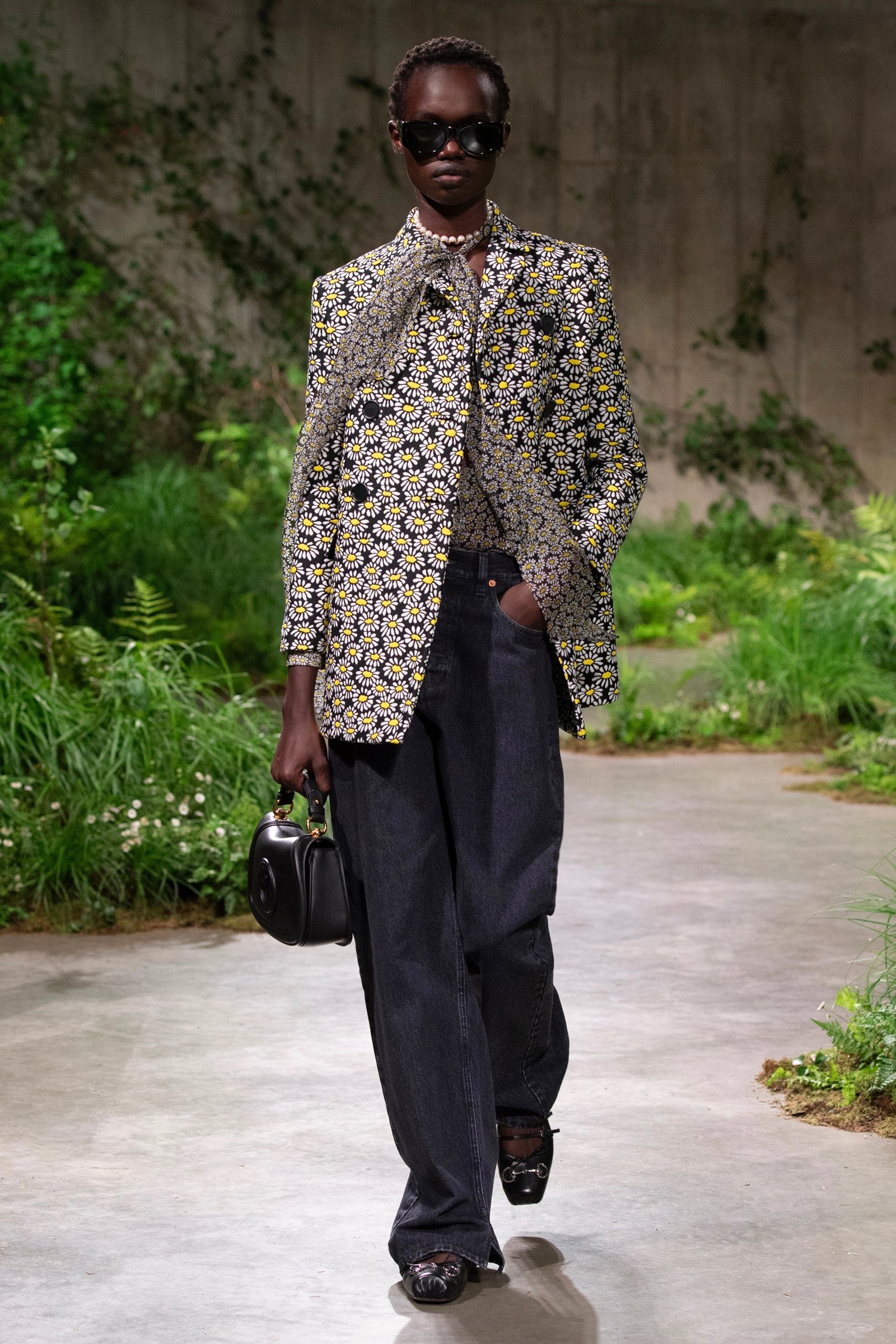 特徴的だったのは、カモミールのフラワーモチーフ。冒頭のブラウスや、レースのスカート、ジーンズ、テクニカルギャバジンで仕立てられたアウター、シフォンドレスに、刺繍や3Dレーザーカット、プリントなどさまざまな方法で施され、ソフトで可憐な印象。サバトが就任して以来グッチで提案してきた日常に根差すラグジュアリーのムードをさらに加速させた。