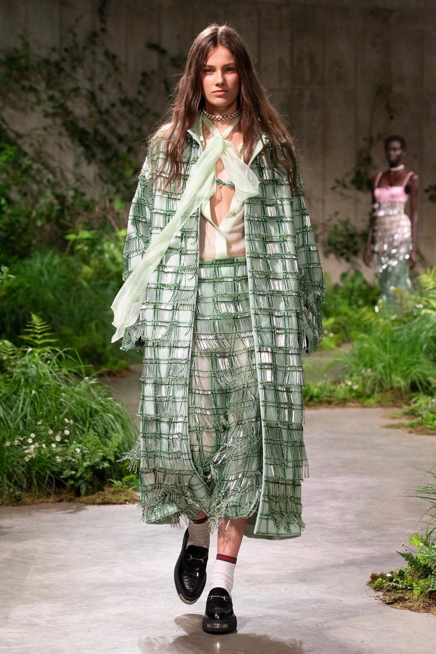 モデルたちは美しい曲線を描く螺旋階段から登場。ファーストルックは、スエードにGGパターンがエンボスされたダブルブレストのジャケットに、シフォンのボータイシャツと、ローウエストのウォッシュドジーンズをスタイリング。続くルックでも、レザーのアウターとオーガンザドレス、ジップアップジャケットとシフォンスカートなど、素材のタフさと軽やかさ、フォーマルとカジュアルといったコントラストが目立った。