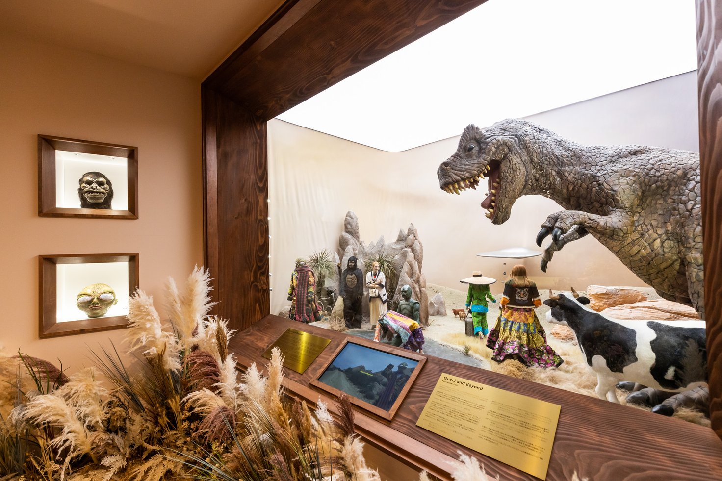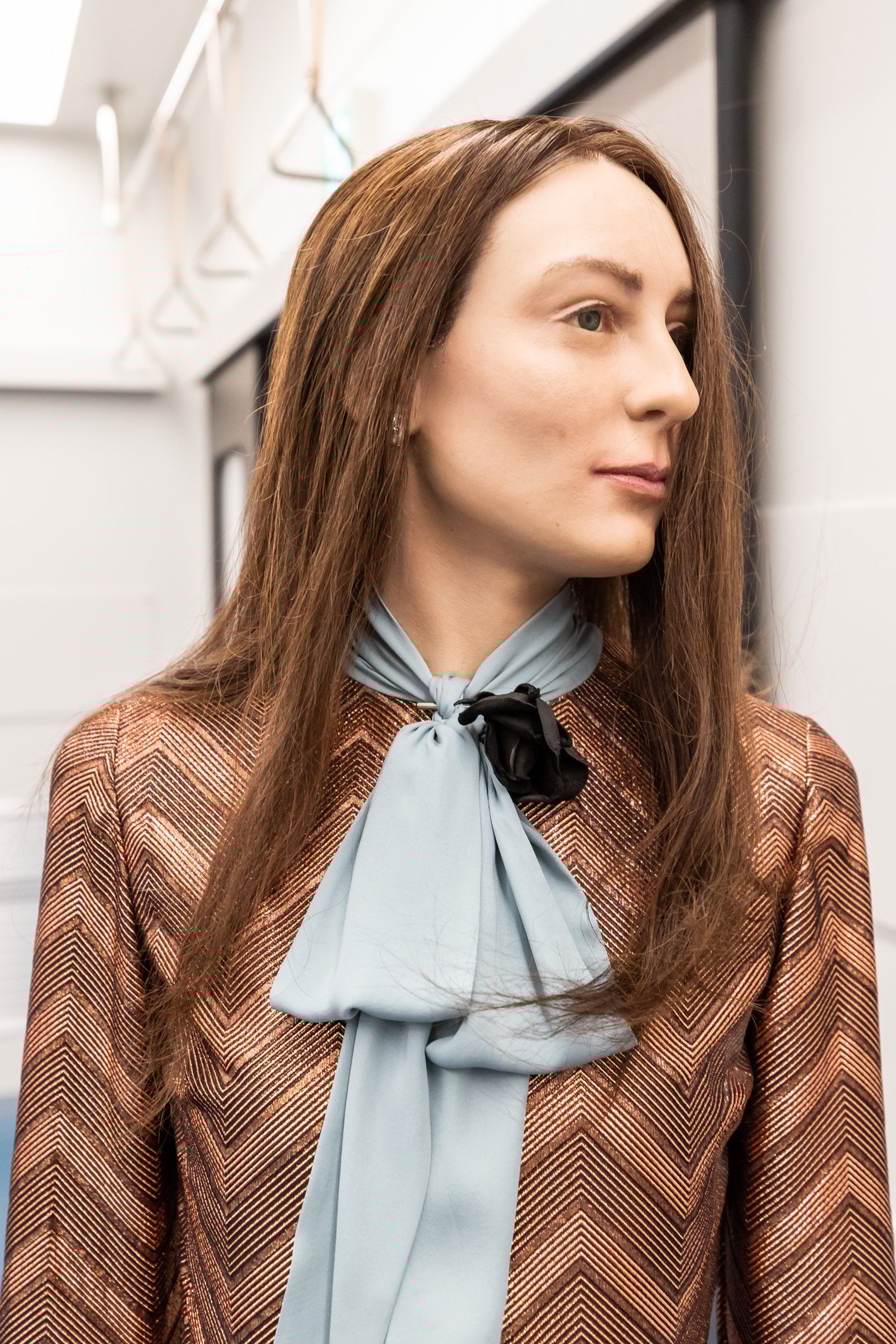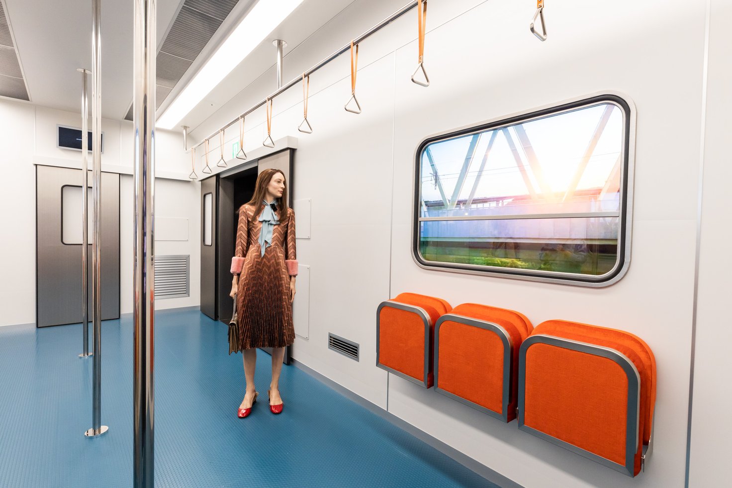 つり革や座席の細部までLAの地下鉄を再現した部屋は、ミケーレのデビューコレクションとなった2015年秋冬の広告キャンペーンがレファレンスに。グッチではお馴染み、写真家グレン?ルックフォード(Glen Luchford)が初めて撮影を手掛けたシーズンでもあります。「欲望が解放され、白昼夢が生み出される場所」という抽象的な表現が用いられた車両に乗り合わせた1人の乗客。肌のしみから血管、風になびく髪に至るまで近くで見れば見るほどリアルすぎるマネキンは、キャンペーンで描かれた旅の物語の一瞬を取り出して具現化したものといいます。