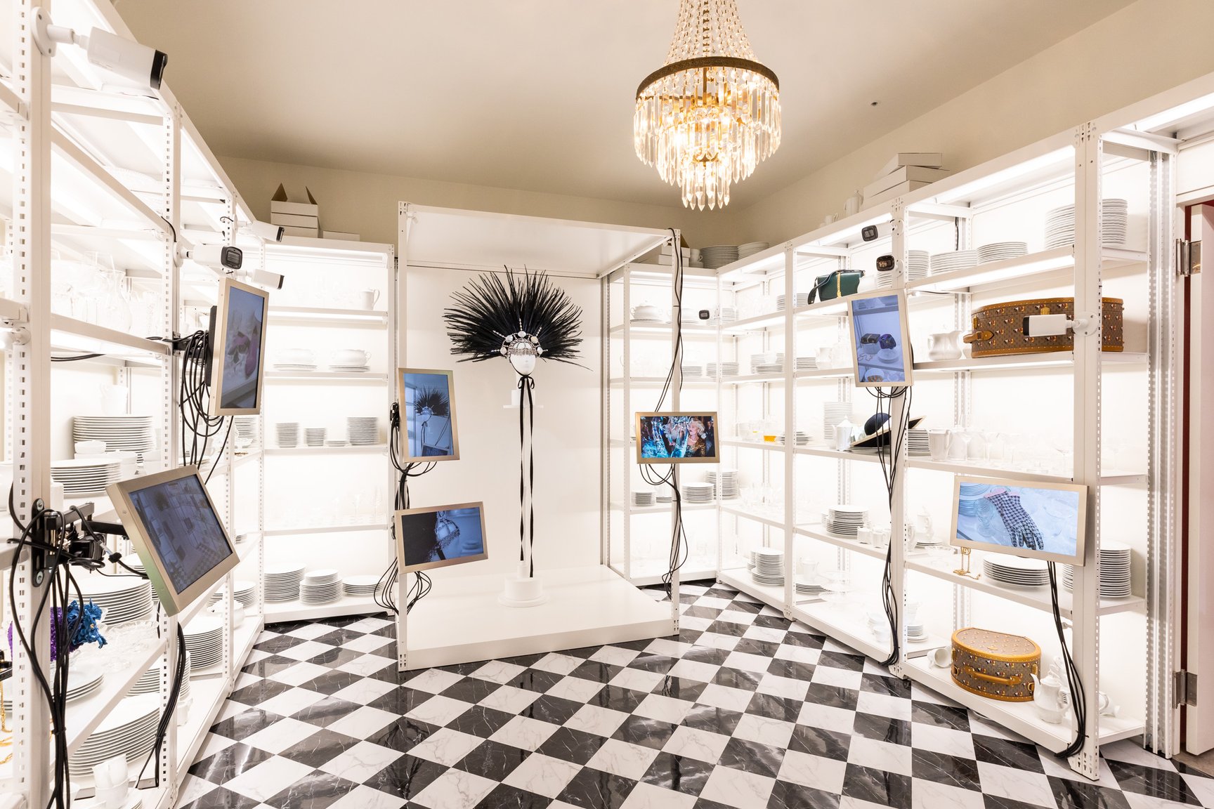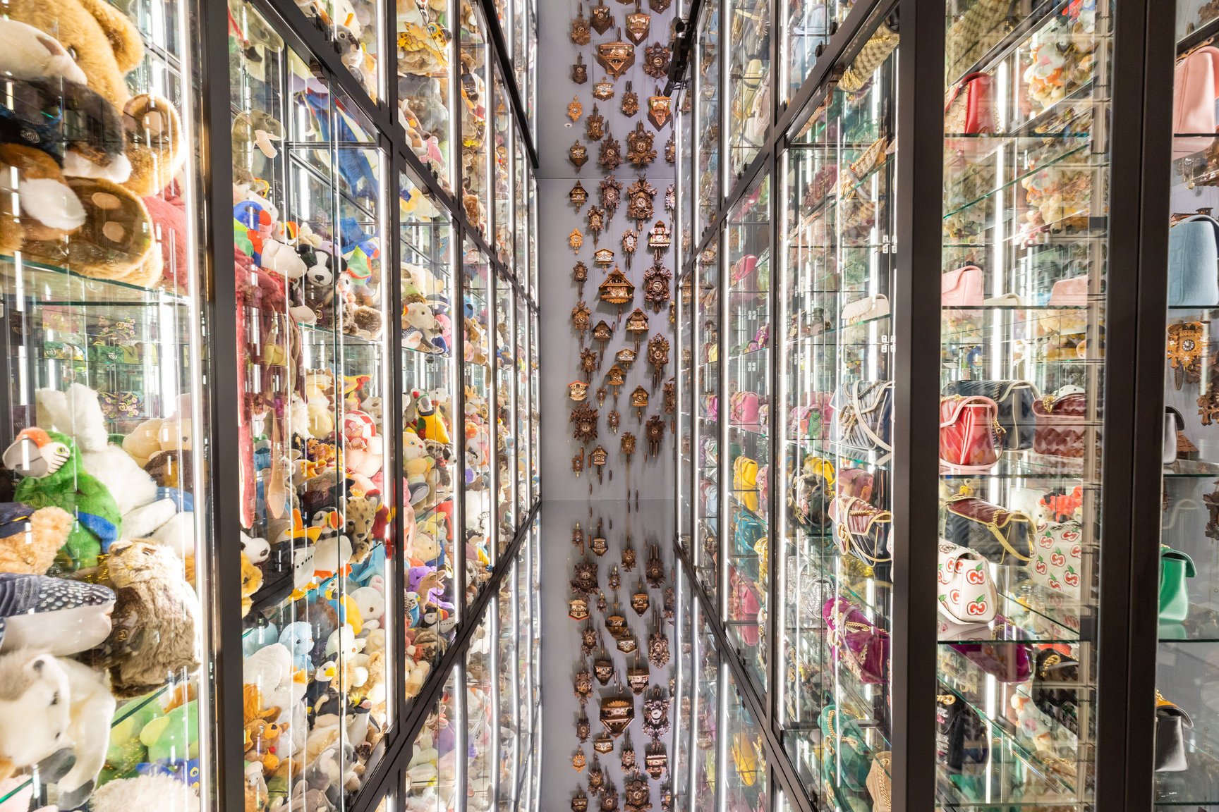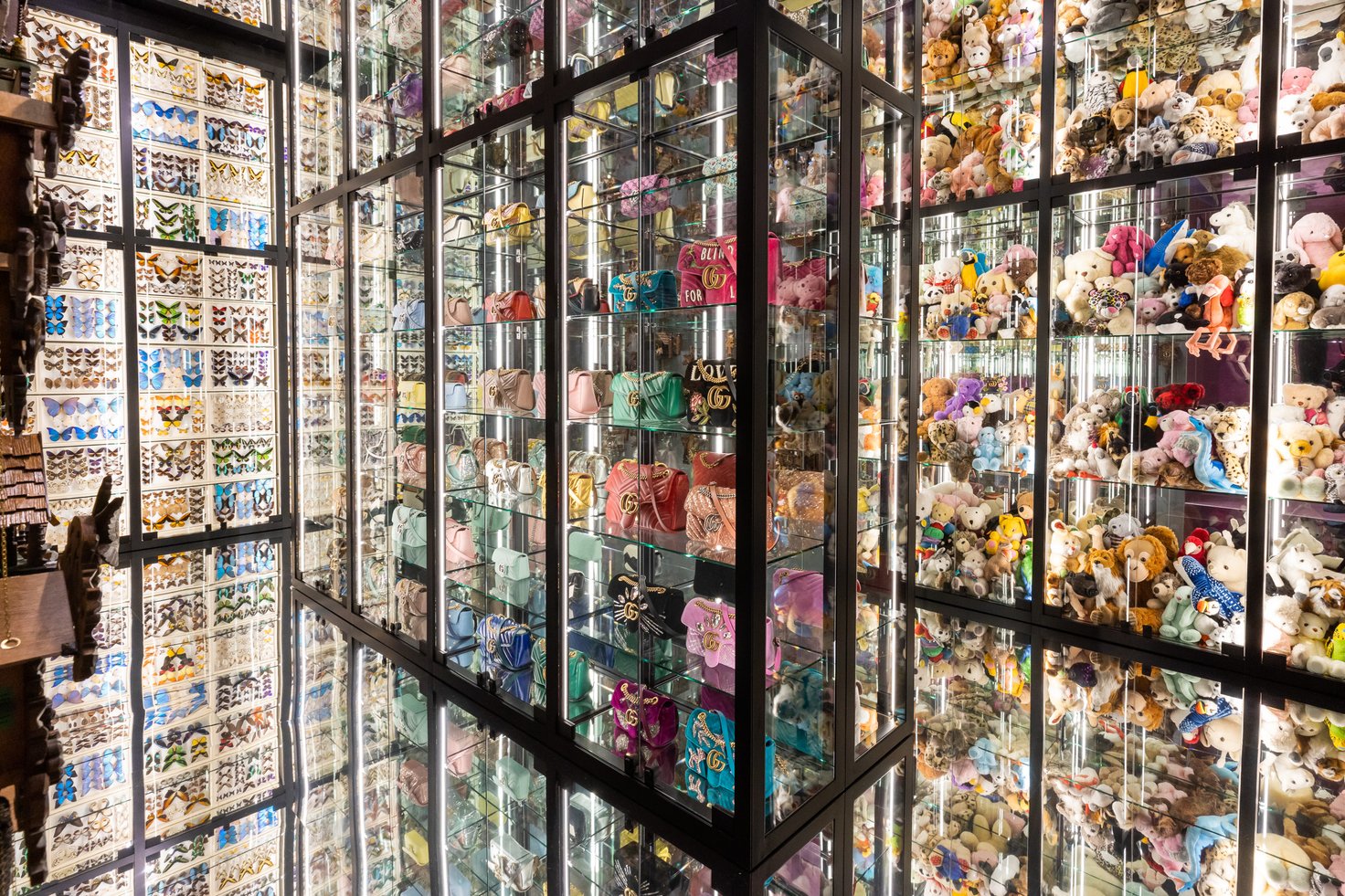 足を踏み入れた瞬間に思わず息を呑む鏡張りの部屋。コレクターズアイテムの数々が陳列され、まるで無限に広がっているような感覚に陥ります。蝶の標本からぬいぐるみ、動いている鳩時計まで、嗜好の強い収集品が並びます。部屋の中心にズラリと陳列されているのは、様々なサイズや素材、カラーやモチーフの「GGマーモント」。コレクターの熱狂的な情熱や偏愛がぎっしりと詰め込まれた空間は、どこか人間のエキセントリックさを感じさせるほど。