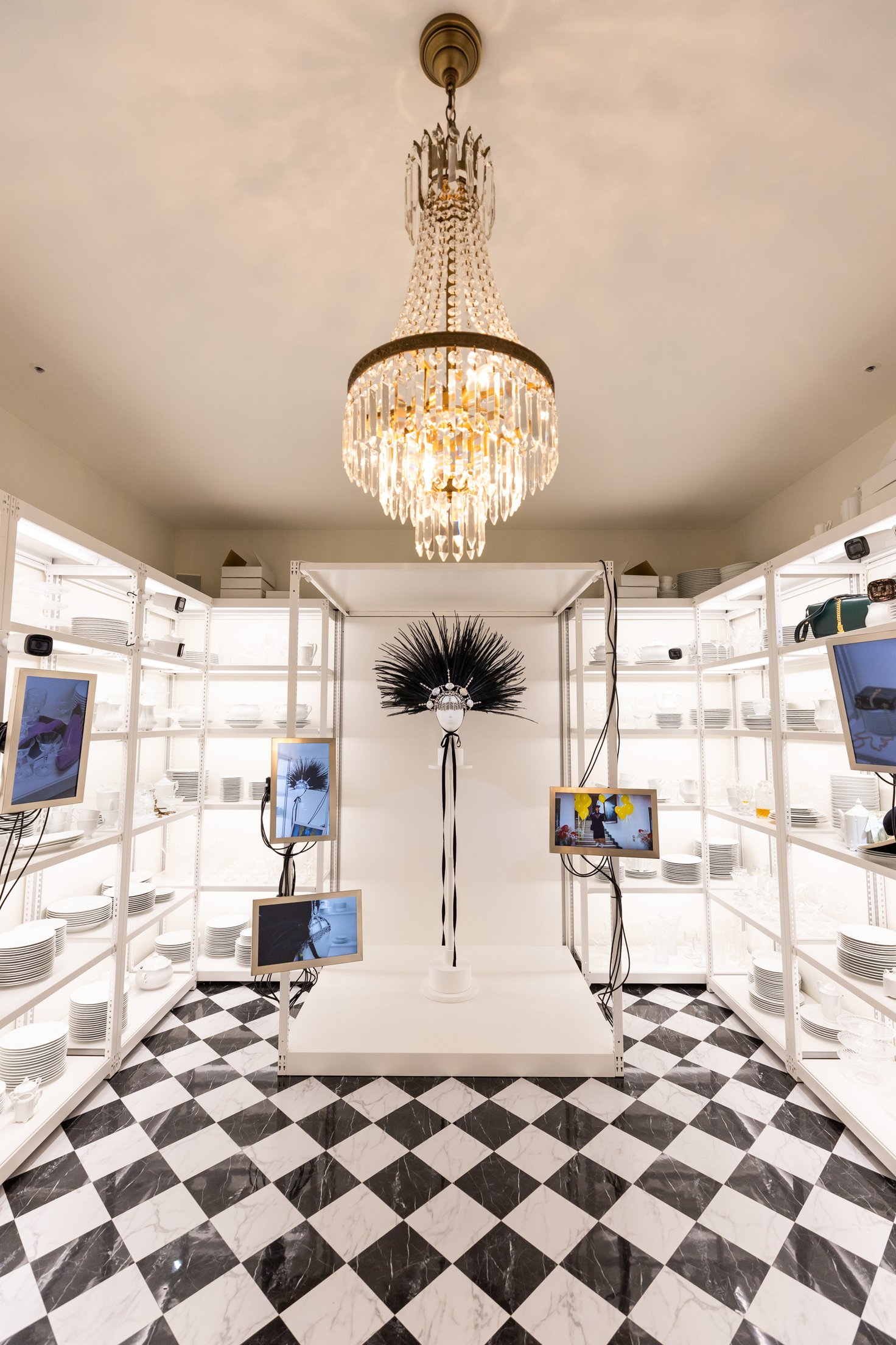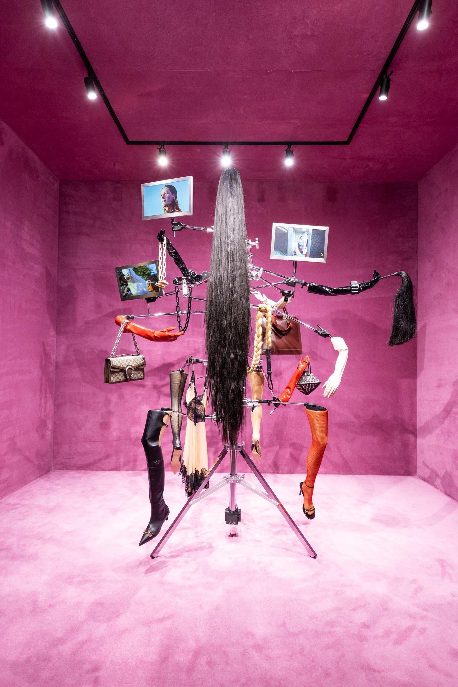 シュールな機械仕掛けのオブジェにかかっているのは、2020年春夏コレクションでフェテッシュな印象を放ったシューズやランジェリードレス、鞭といったアイテム。不気味な"髪"の正体は、ギリシャ人監督ヨルゴス?ランティモスが手がけたショートフィルムをチェックすれば解るはずです。