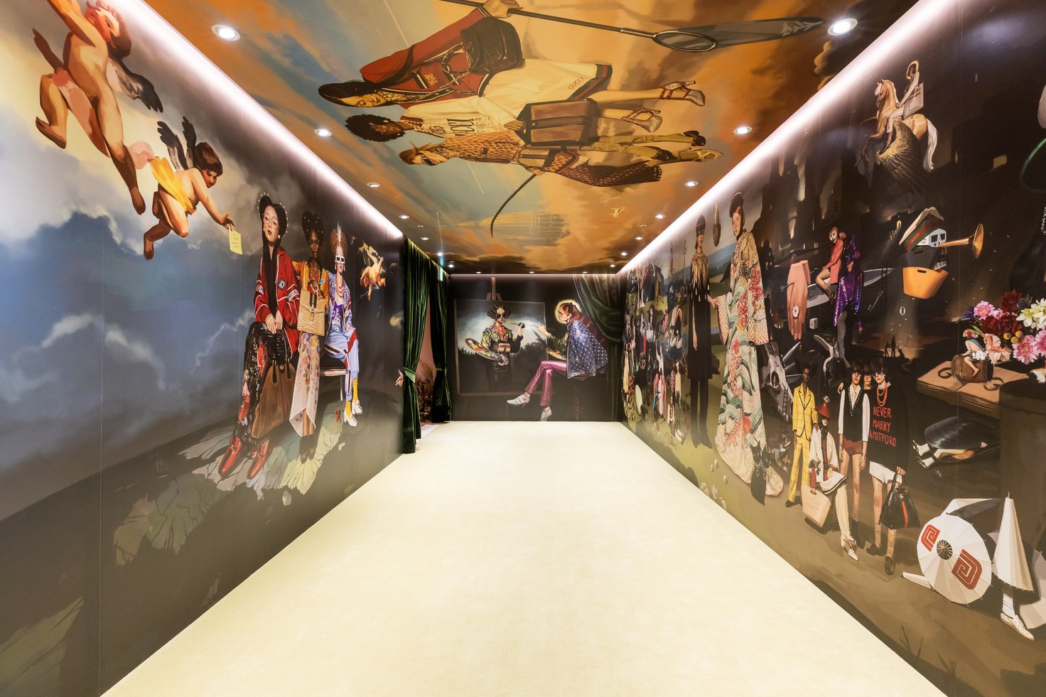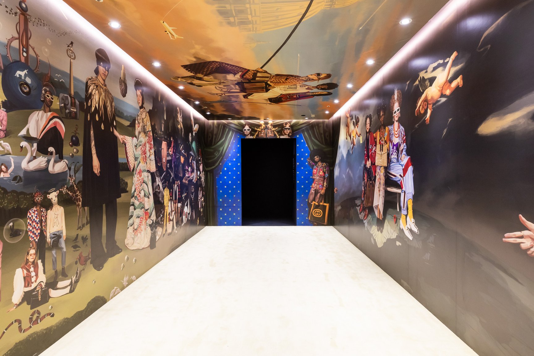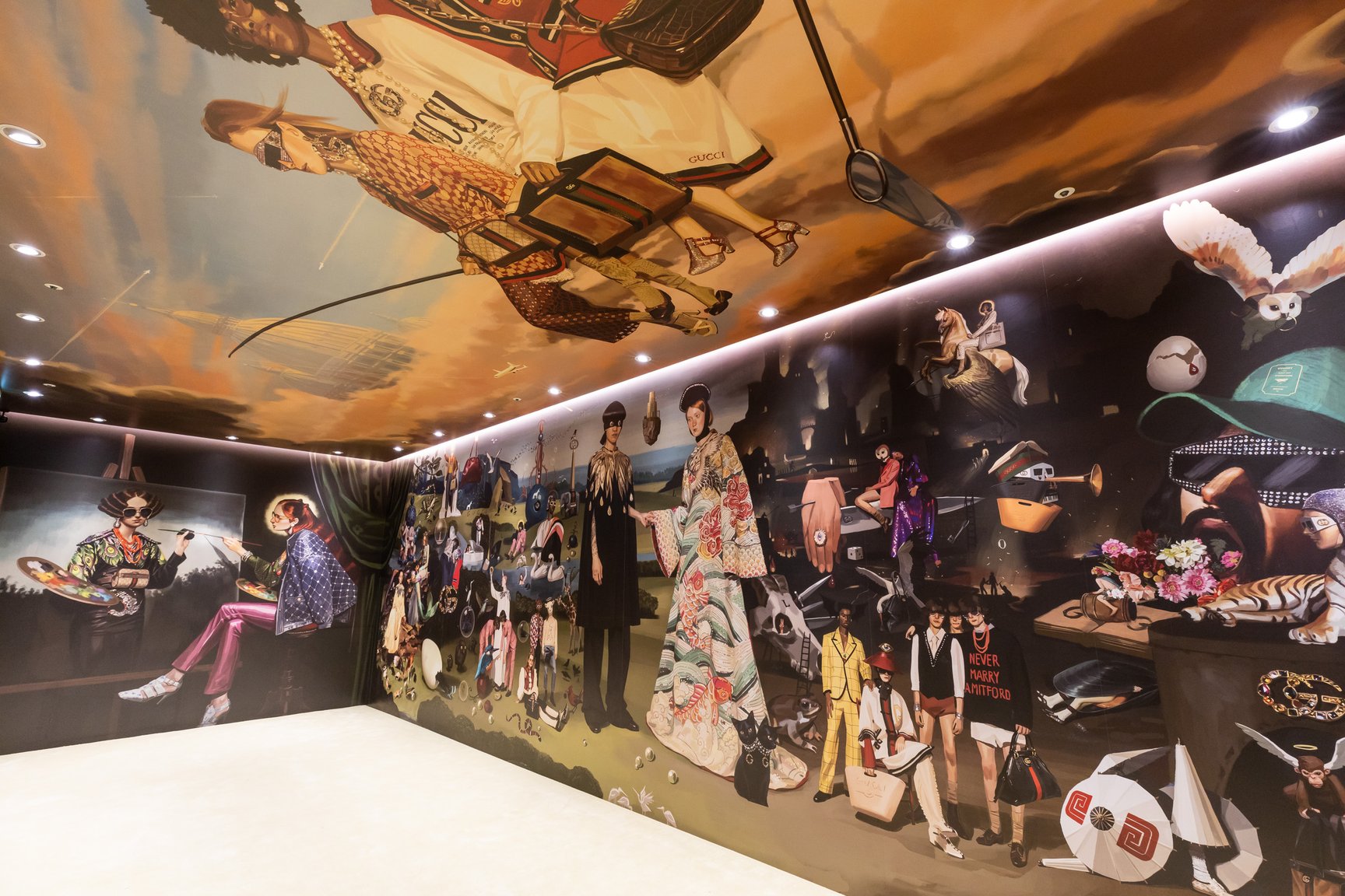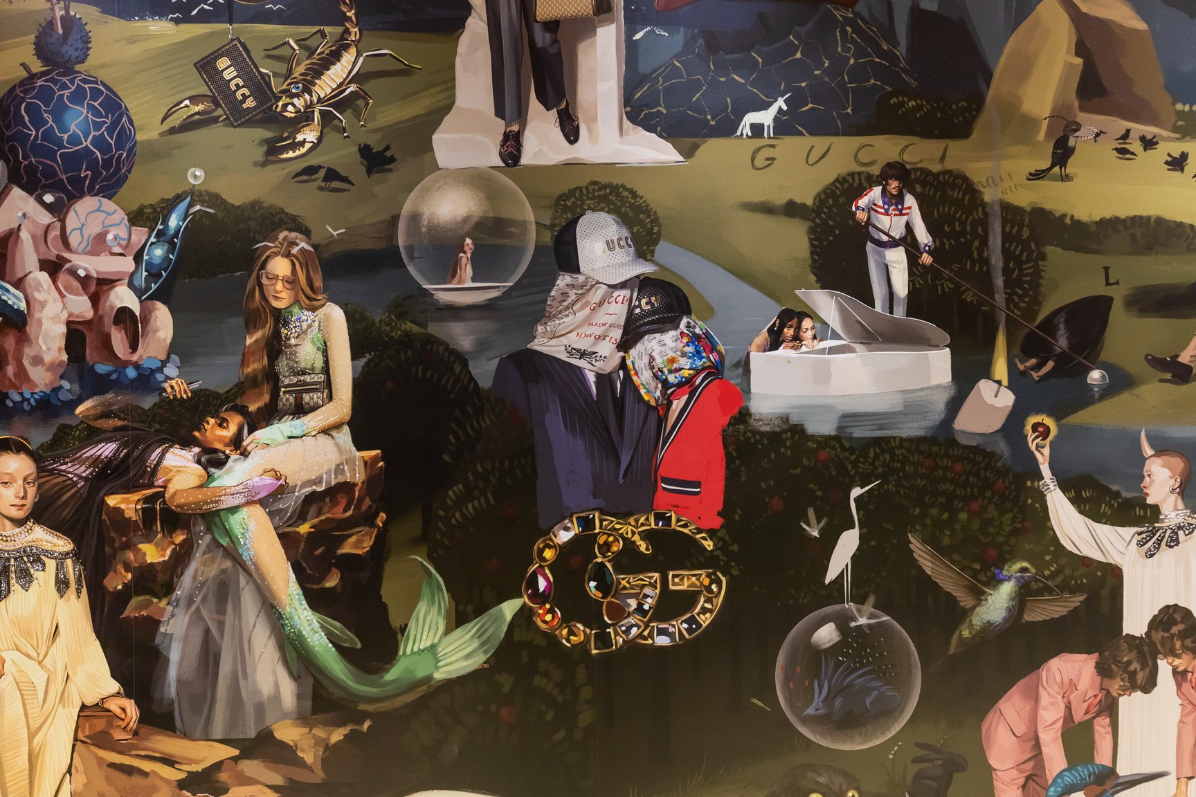 実際のモデルではなく絵の中のモデルにコレクションを着せるという斬新な方法で見るものに驚きを与えた2018年春夏の広告キャンペーン。ミレーの名画「オフィーリア」を彷彿とさせるシュールレアリスティックな絵画ポスターを駅や街中で目にした人も多いのでは?スペイン人アーティスト イグナシ?モンレアル(Ignasi Monreal)は当時、1日14時間×数カ月、計866時間にも及ぶ制作期間を経てコレクションの世界観を描きあげたといいます。部屋の隅々まで目を凝らして鑑賞したいアートな空間。ちなみにキャンペーンムービーではモンレアル本人がグッチギャラリーのキュレーターに扮して登場しています。
