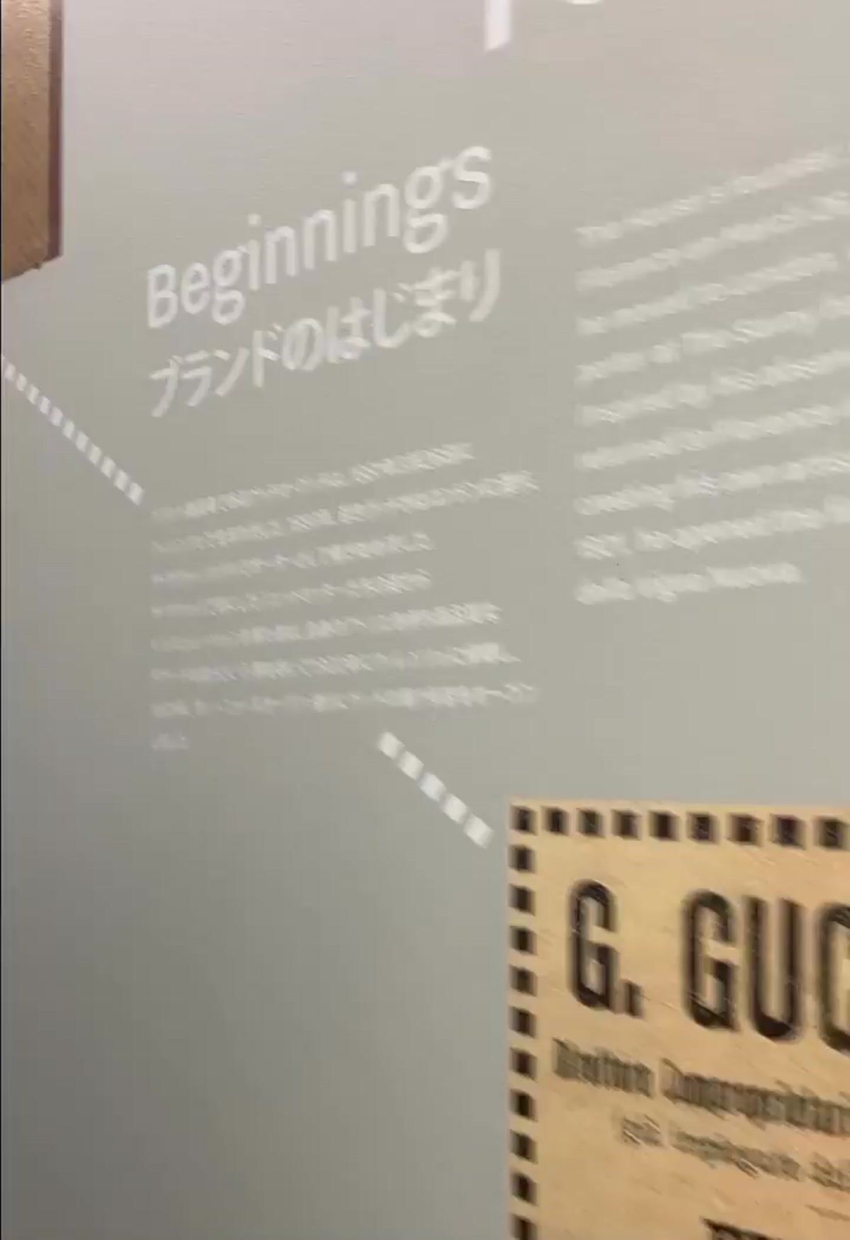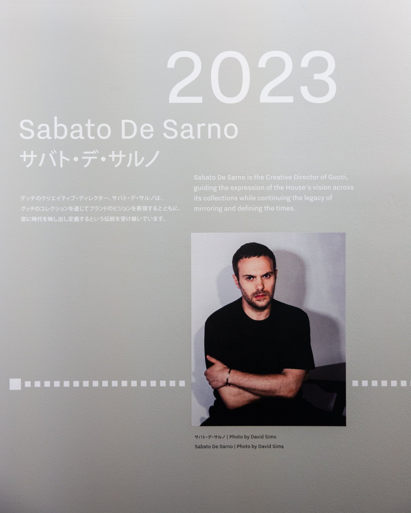 2フロアにわかれた会場の6階と7階をつなぐ階段には、グッチの歴史年表を展示。ブランドのはじまりから、象徴的な事柄、そして歴代のクリエイティブ?ディレクターについてまで、1世紀以上にわたるストーリーを階段を登りながら知ることができる。
