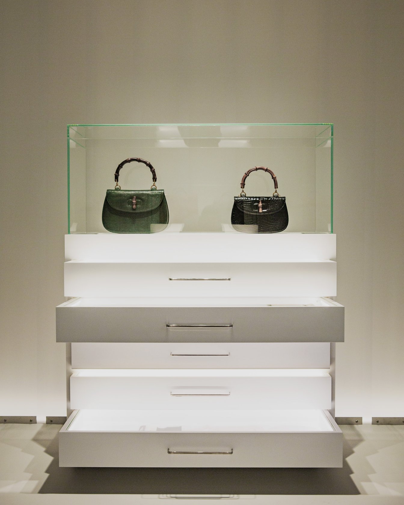 7階の「CODES」ルームに到着。フィレンツェにあるグッチアーカイヴの保管庫を表現したフロアに、グッチのアイコニックなコードと象徴的なアイテムがずらりと並ぶ。