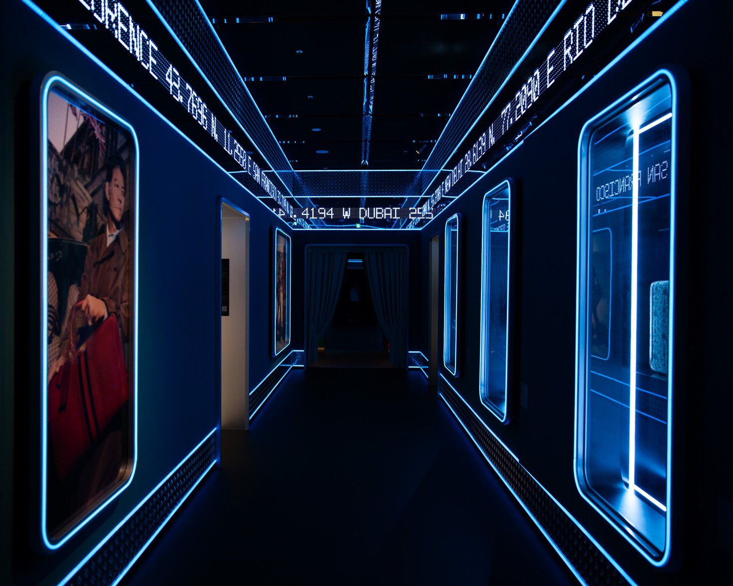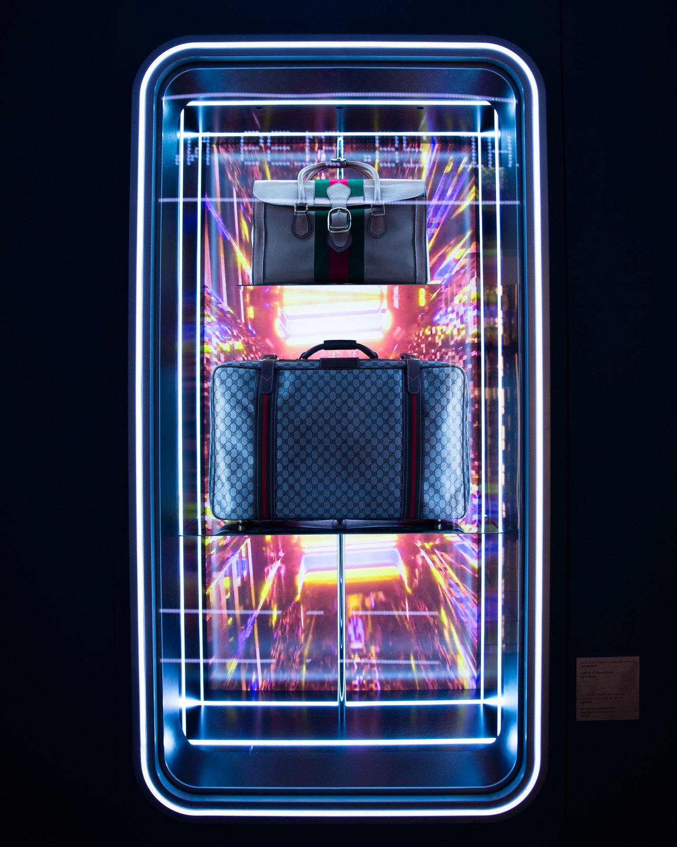 最初に来場者を迎えるのは、フューチャリスティックな空間に貴重なアーカイヴアイテムが並ぶ「TRAVEL」ルーム。19世紀末、グッチオ?グッチが故郷のフィレンツェからロンドンに旅立ったことから始まったグッチの物語を、タイムマシンのように時空を超えて体験することができる。