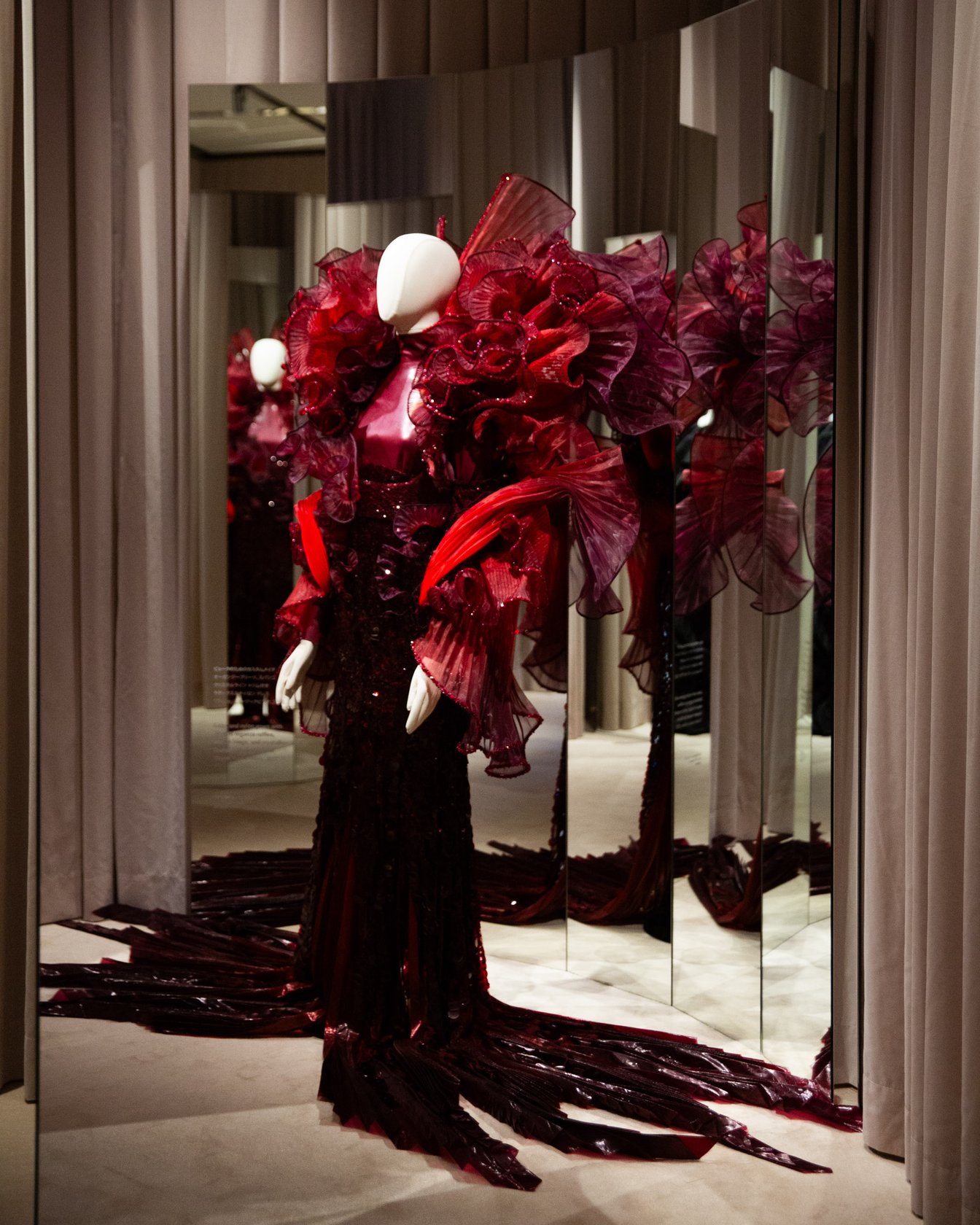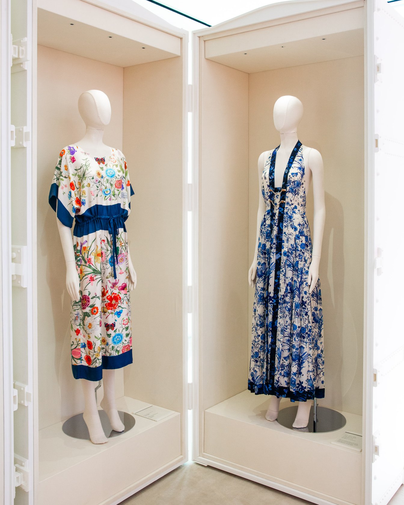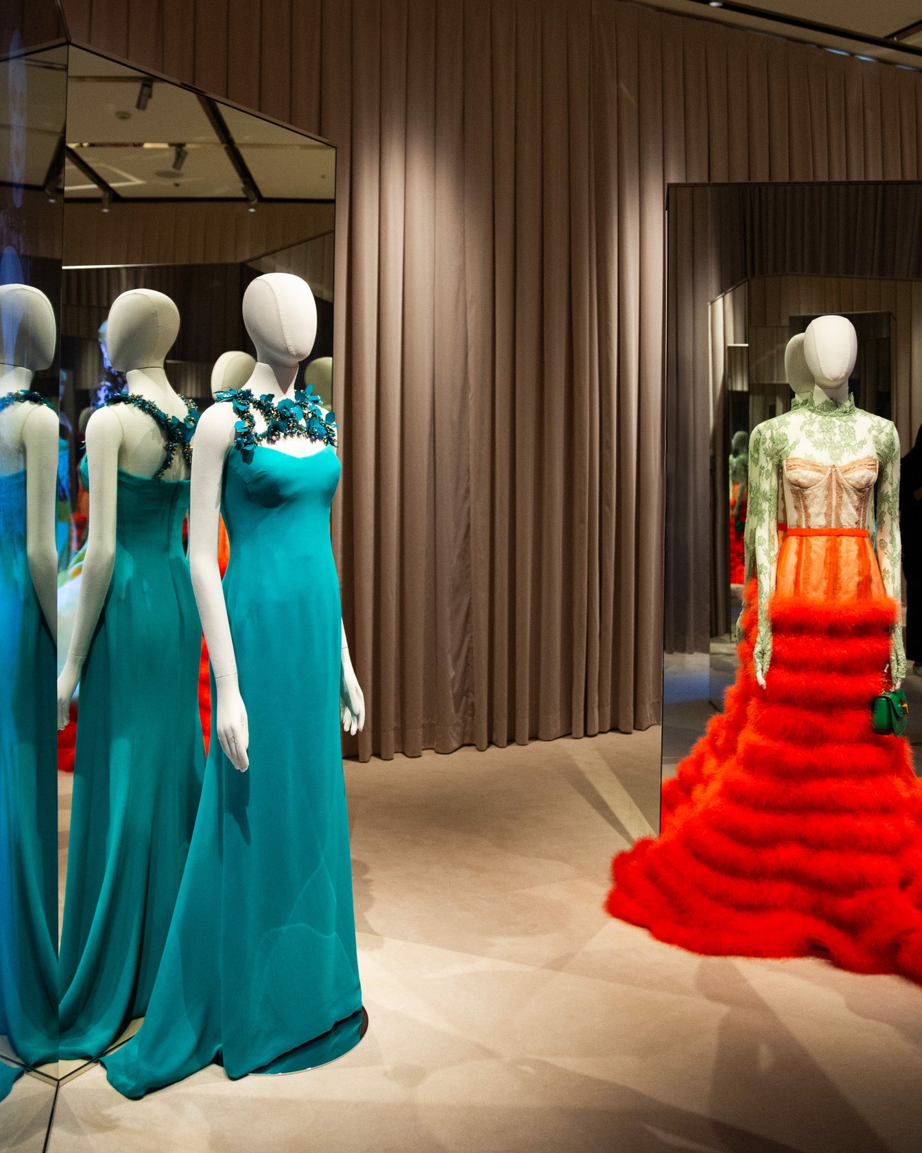 レディ?ガガやビョークといったスターらが、レッドカーペットやライブステージで実際に着用したドレスの数々は、グッチの職人が手掛けた見事なディテール。その技術の繊細さを、間近に見ることができる。