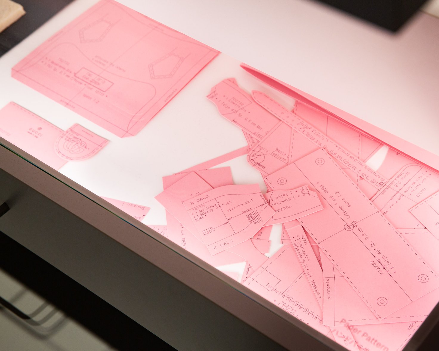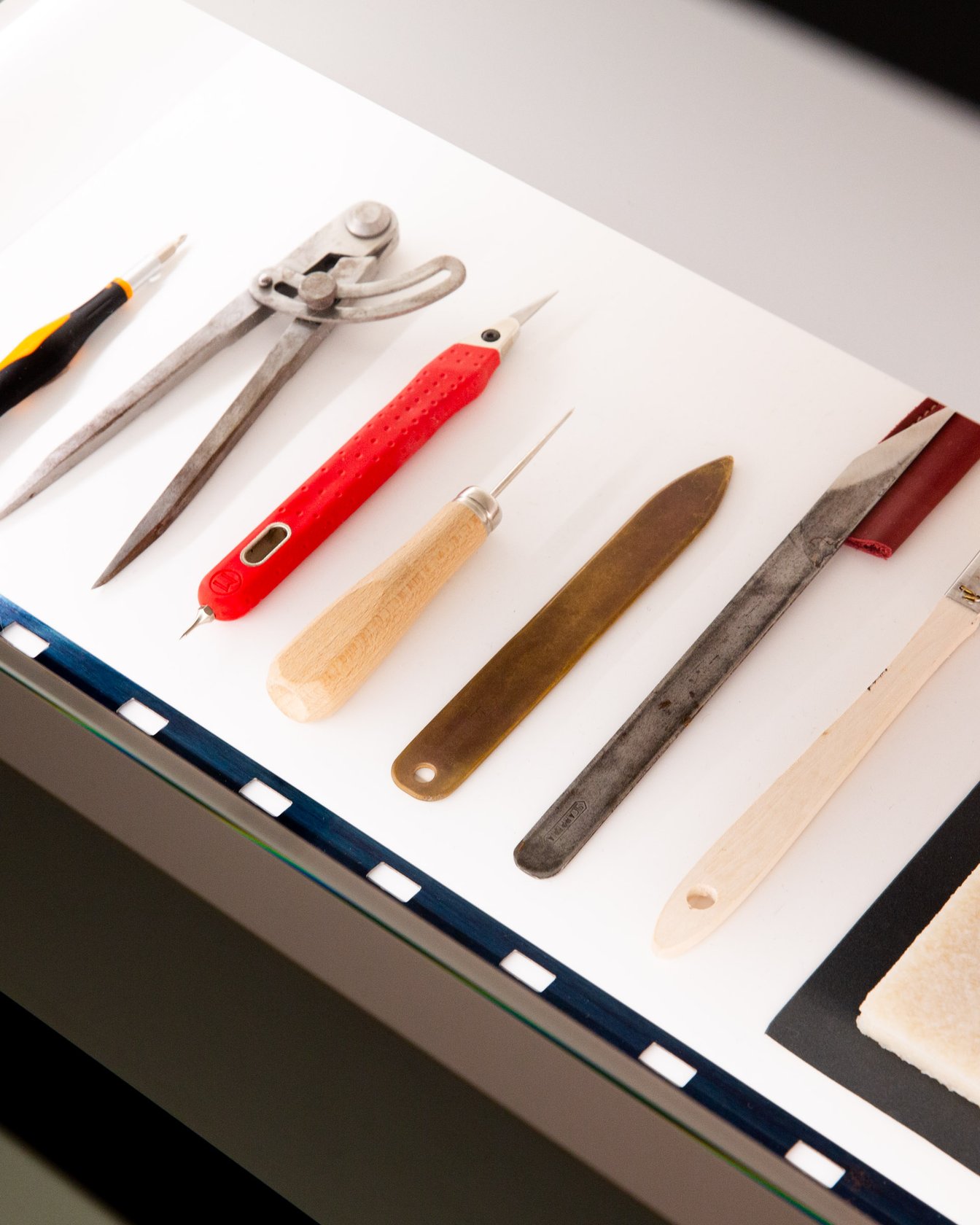両サイドには、職人が実際に用いている道具や型紙、バッグのパーツの展示も。