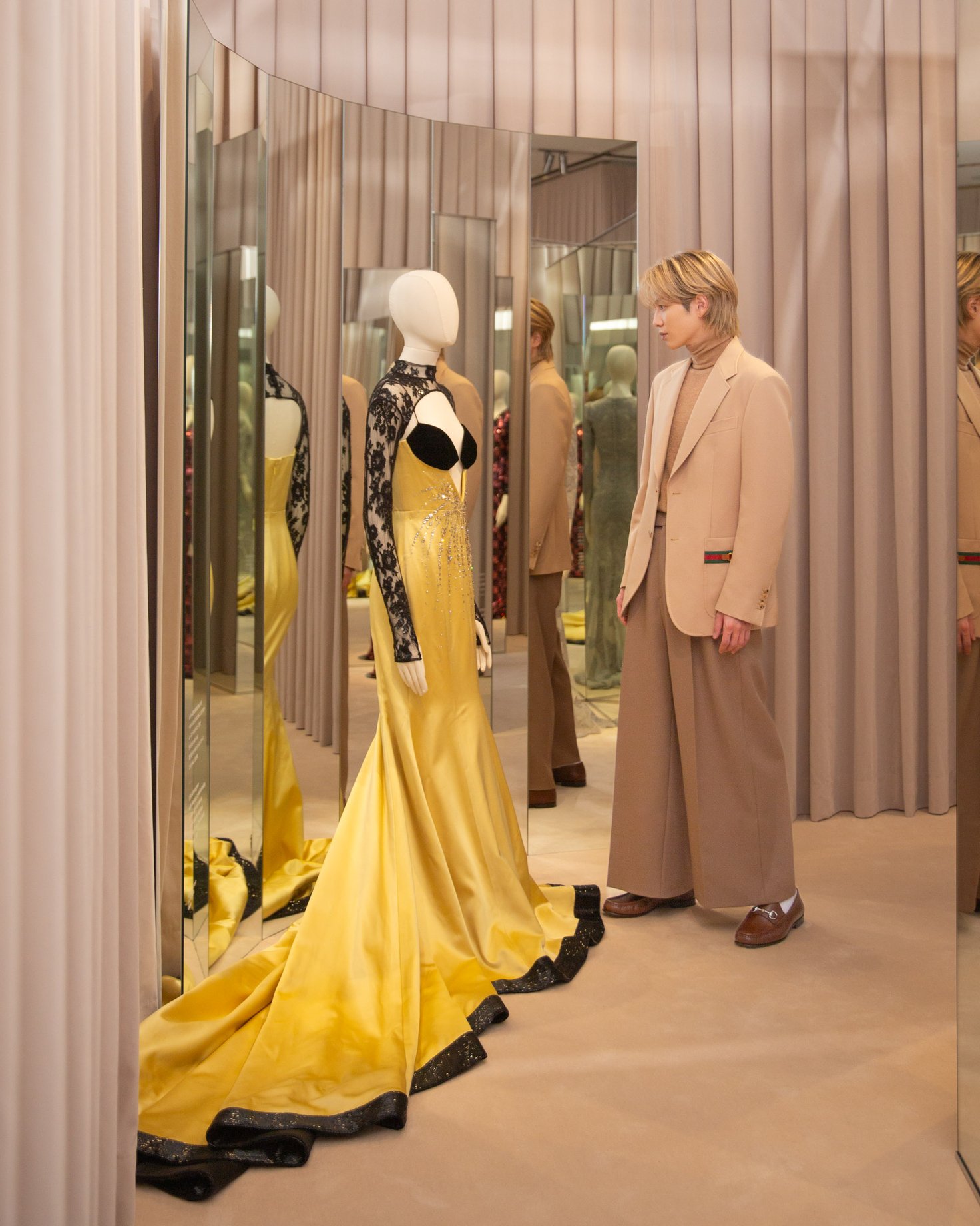 グッチか?100年以上にわたって育んて?きた偉人やセレブリティ、クリエイターやアーティストたちとの関係性をたたえる「STARS」ルーム。ミラーとデシ?タルスクリーンの相乗効果による迷路のようなフロアに、カスタムメイドのドレスが展示されている。