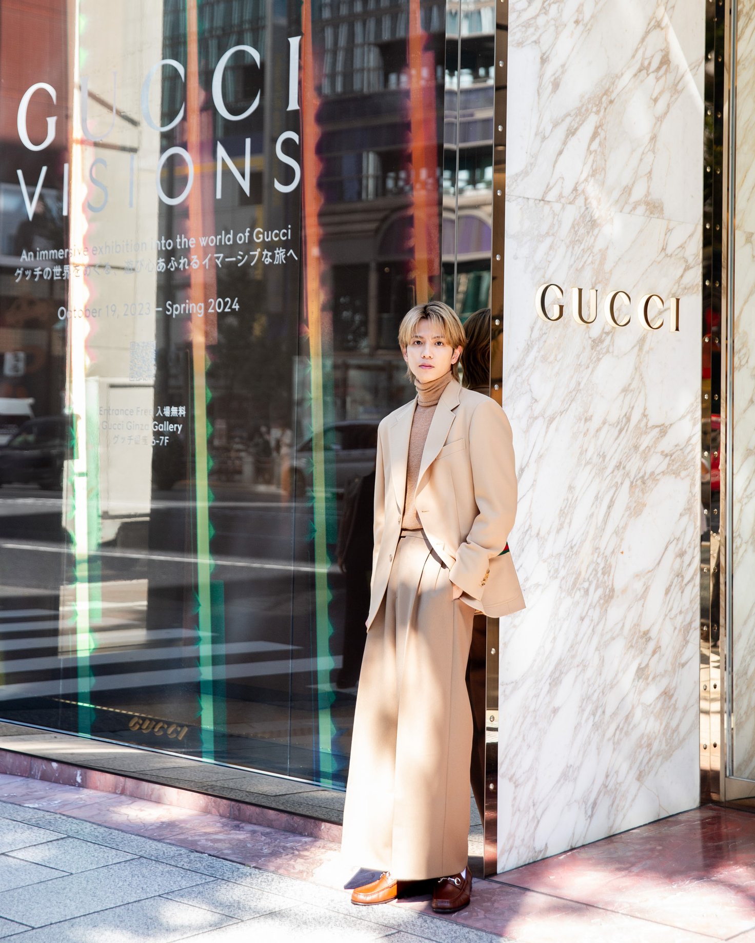 秋晴れの10月中旬、街路樹の木漏れ日が差す「グッチ銀座」のエントランス前に志尊淳の姿があった。主演を務めるドラマのために変えたという明るい髪色に、クラシカルなベージュトーンのテーラードスタイルが馴染んでいる。