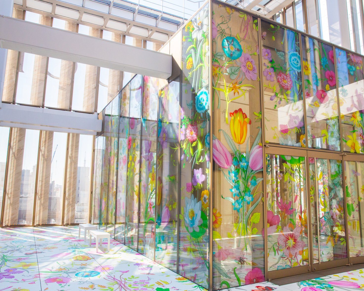 フィレンツェの紋章に使われているユリをはじめ、季節の花々による幻想的な世界観の中を歩き、そして中央の階段を登って「グッチ銀座ヒ?ル」の屋上へ。色とりどりの「フローラ」プリント越しに、いつもとは違った銀座の街を見下ろすことができる。