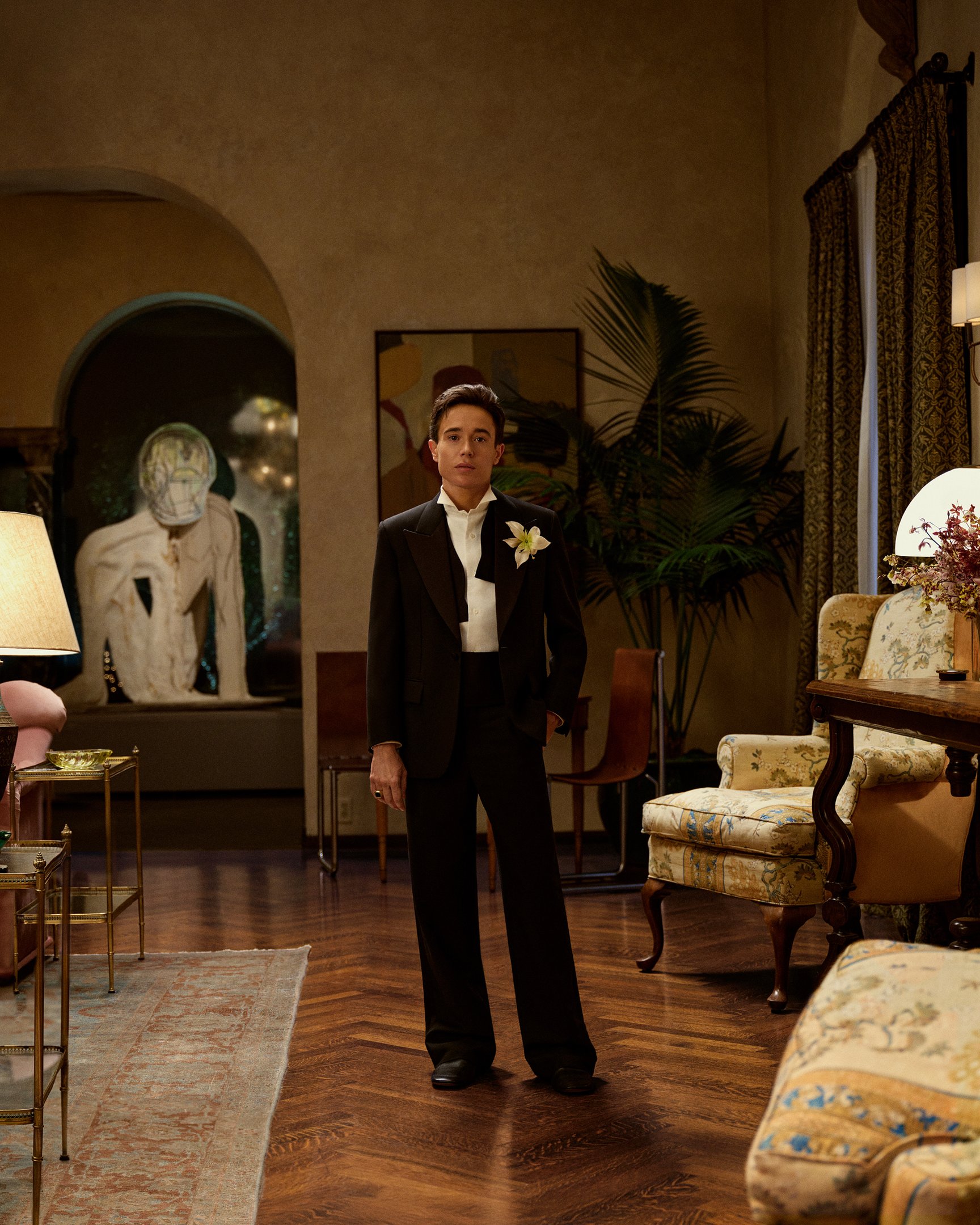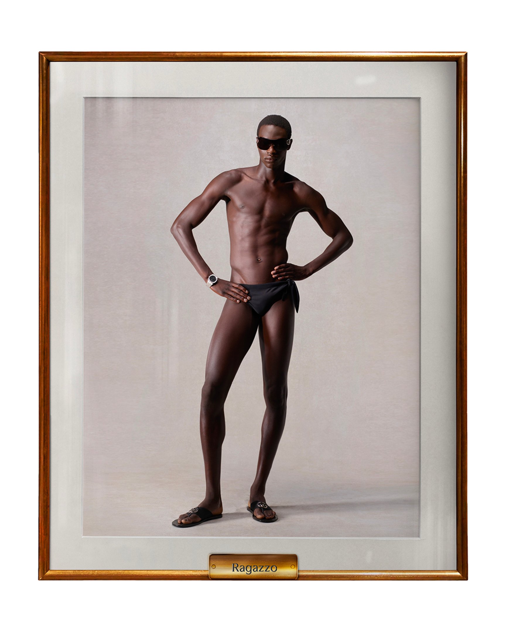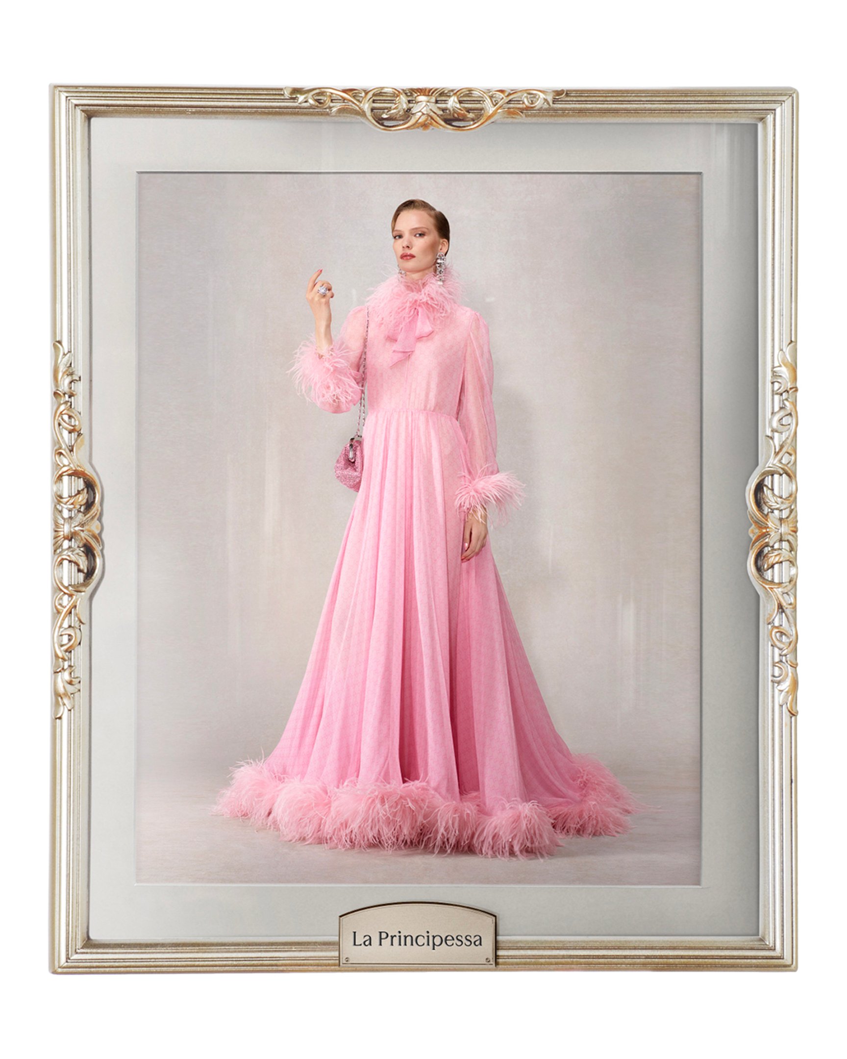 シルエットは、フェザーのオペラコートやハイジュエリーに代表される壮麗なマキシマリズムから、シームレスなレッグウェアが生み出す官能的なネオ?ミニマリズムまで多岐にわたる。メンズウェアにも華やかさが反映され、透け感のあるボディコンシャスなセットアップや洗練されたブラックタイ仕様のスイムウェアなど、現代の「ドルチェ?ヴィータ(甘い生活)」を体現している。