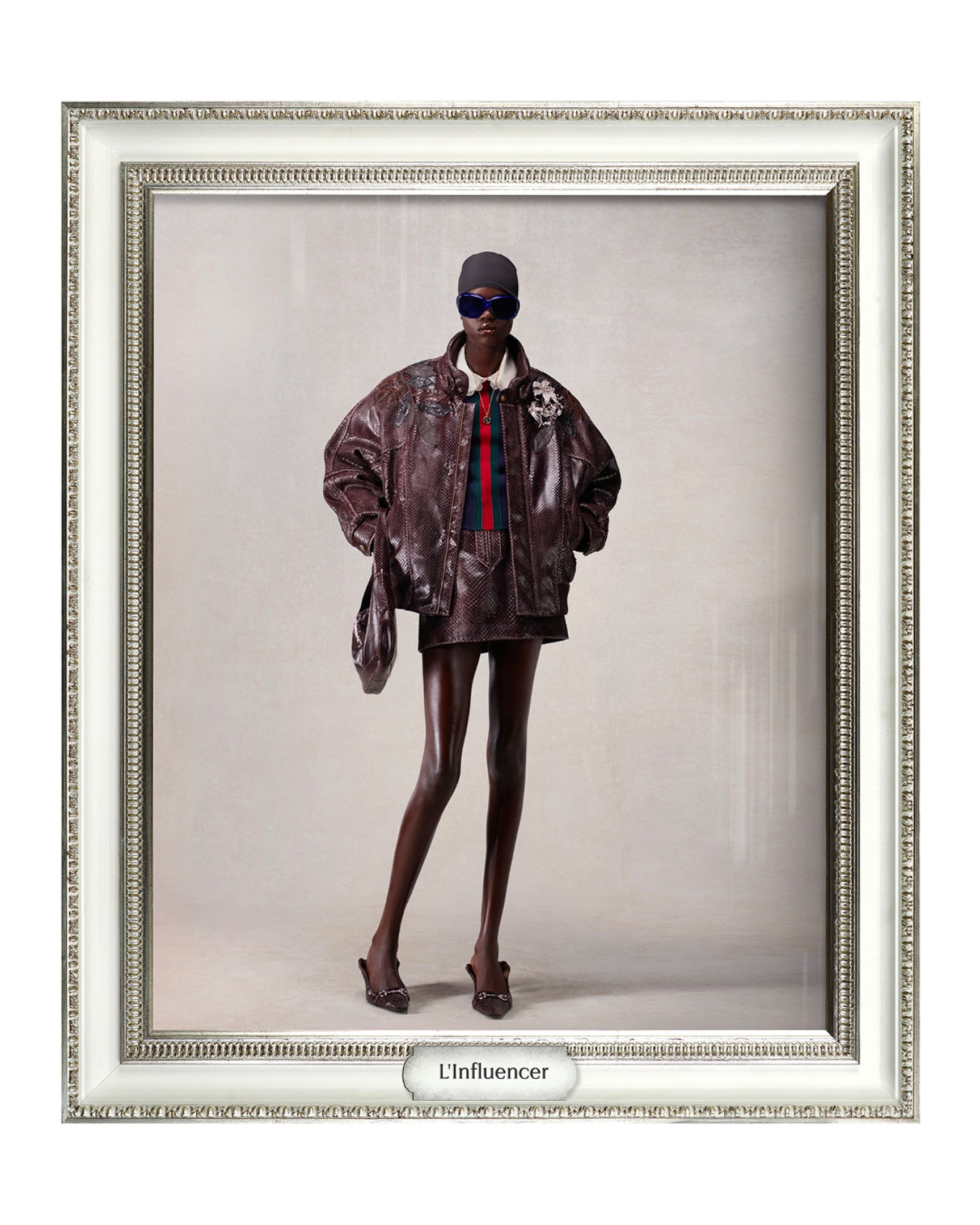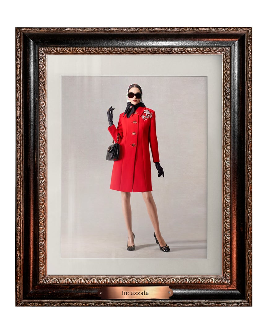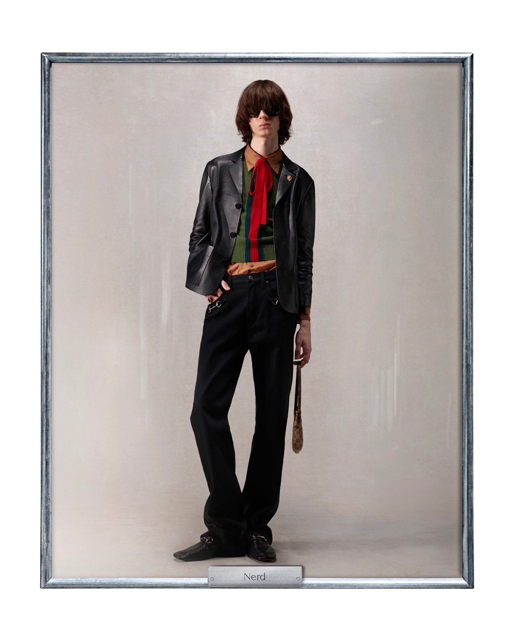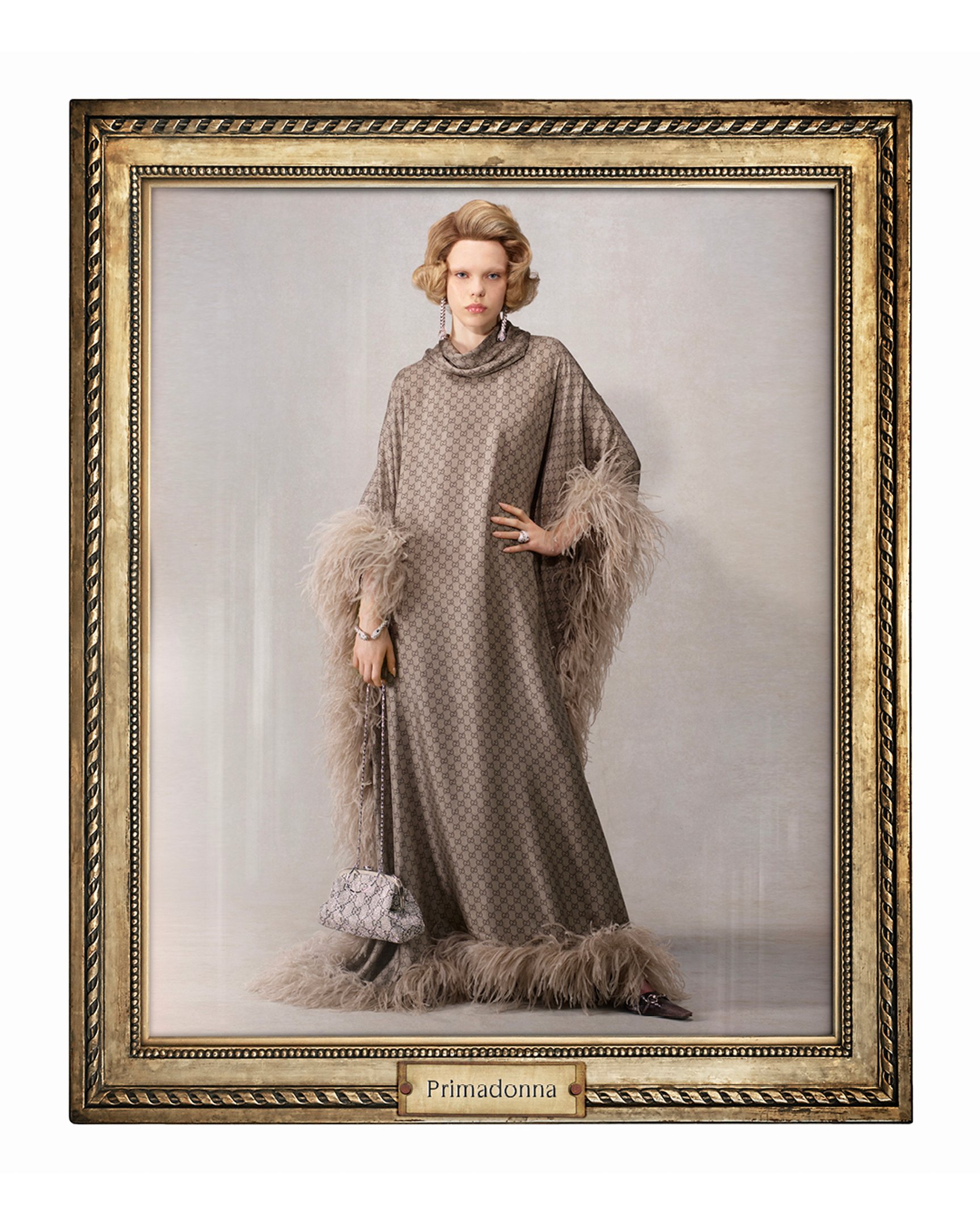 コレクションはグッチの原点であるトラベルグッズへのオマージュから始まる。GGパターンをあしらった「L'Archetipo」のトランクは、創業時のラゲージづくりの伝統を現代に蘇らせている。続いて、60年代風の赤いコートをまとった情熱的な「Incazzata(腹を立てて)」、ストライプに身を包み猫のような魅力を放つ「La Bomba(爆弾)」、凛としたエレガンスを体現する「La Cattiva(悪い人)」など、イタリアン?ライフスタイルのさまざまな人物像が描かれていく。