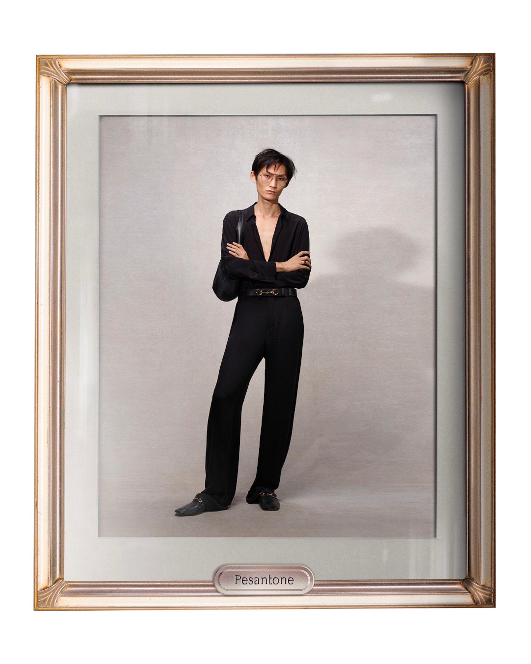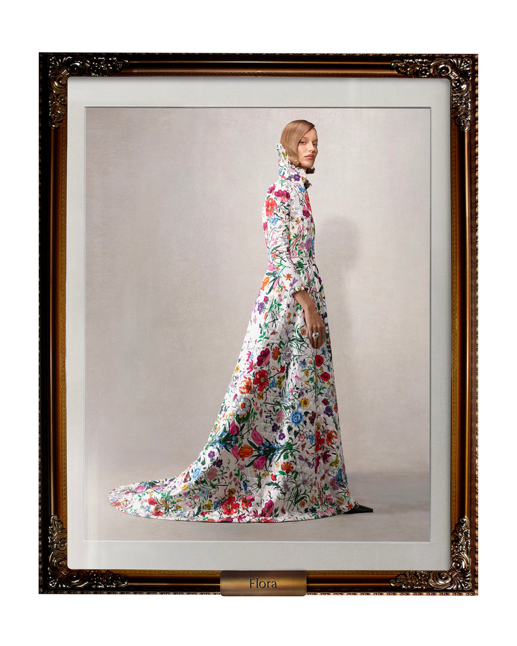 また、イタリア特有のエフォートレスなエレガンスである「sprezzatura(スプレッツァトゥーラ)」、つまりは「計算された自然体」の哲学が全体を貫く。キトゥンヒールのスリングバックやかかとを踏んで履くソフトレザーのミュールなど、完璧さの中に意図的な抜け感を持たせたディテールが随所に見られる。1947年に誕生した「グッチ バンブー 1947」ハンドバッグは新たなプロポーションで登場し、1953年以来のアイコンであるホースビットローファーとともに現代的な魅力を放ち、フローラプリントは変わらぬ美しさと夜をイメージした新解釈の両方で表現され、創業者グッチオ?グッチ(Guccio Gucci)のイニシャルを冠したGGパターンはアイウェアからローファーまであらゆるアイテムに展開される。