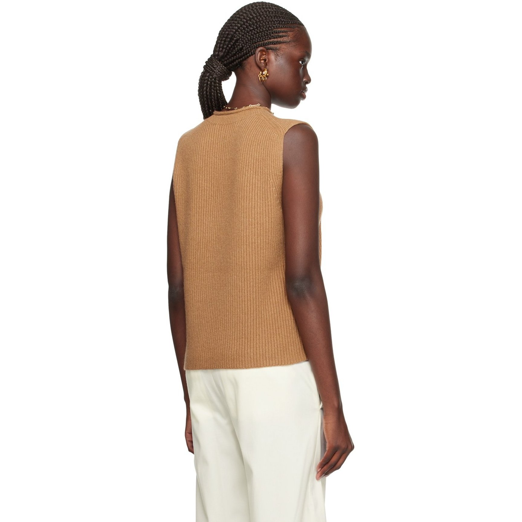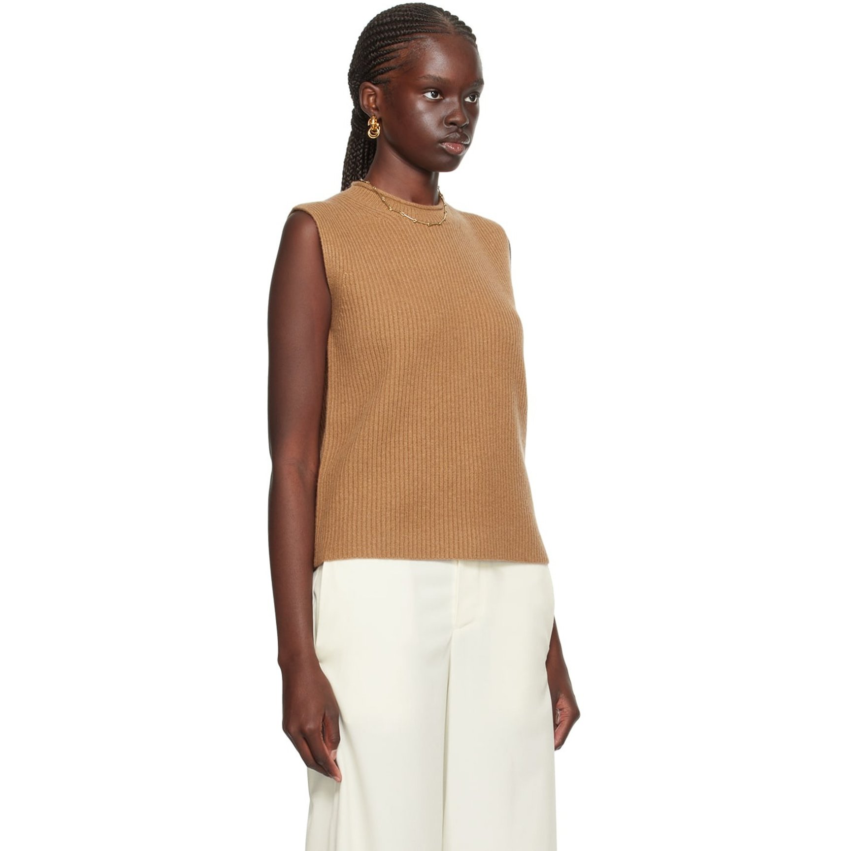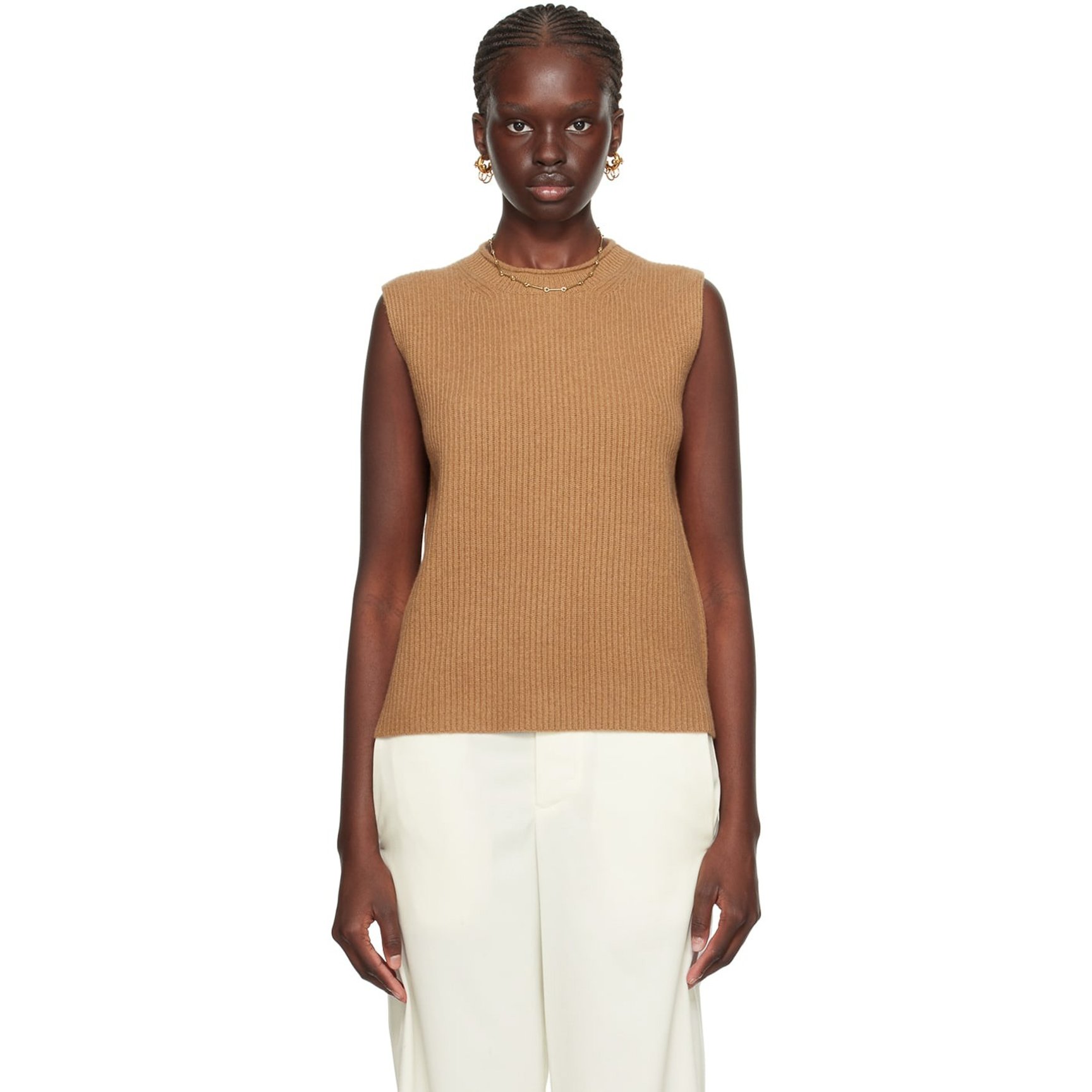 シアートップスやシャツとの合わせもエレガントに決まる、ブラウンのカシミヤベスト。スマートに切り取ったノースリーブとロール状のクルーネックで、ジャケットやドレスとの重ねもコンパクトにまとまります。秋冬シーズンのレイヤードルックに、一点投入してみてはいかが?