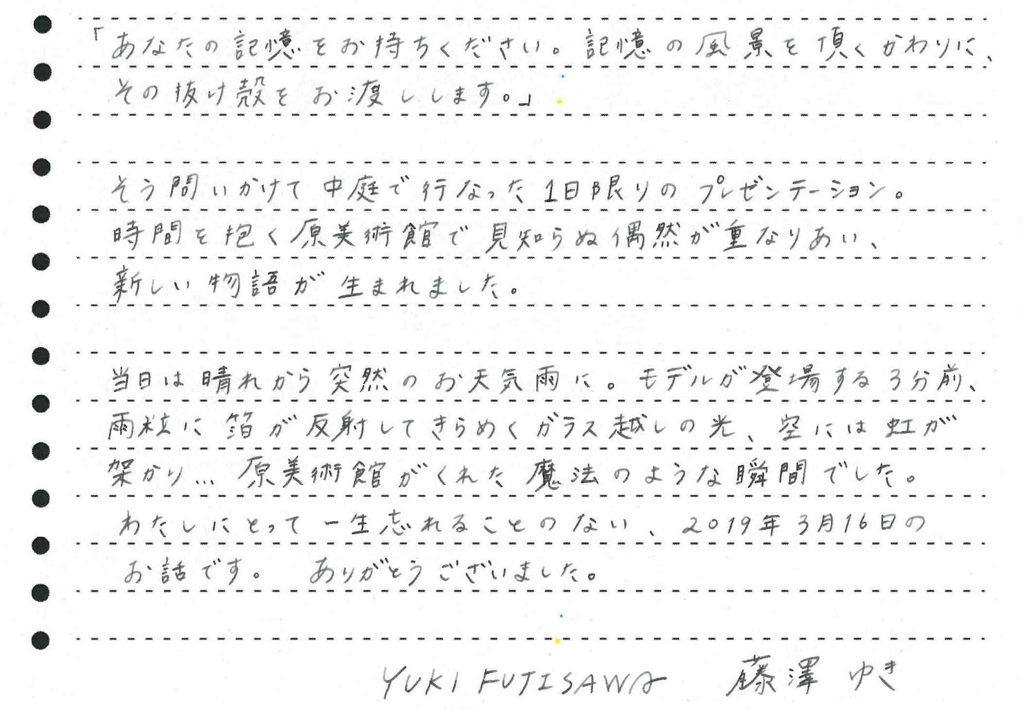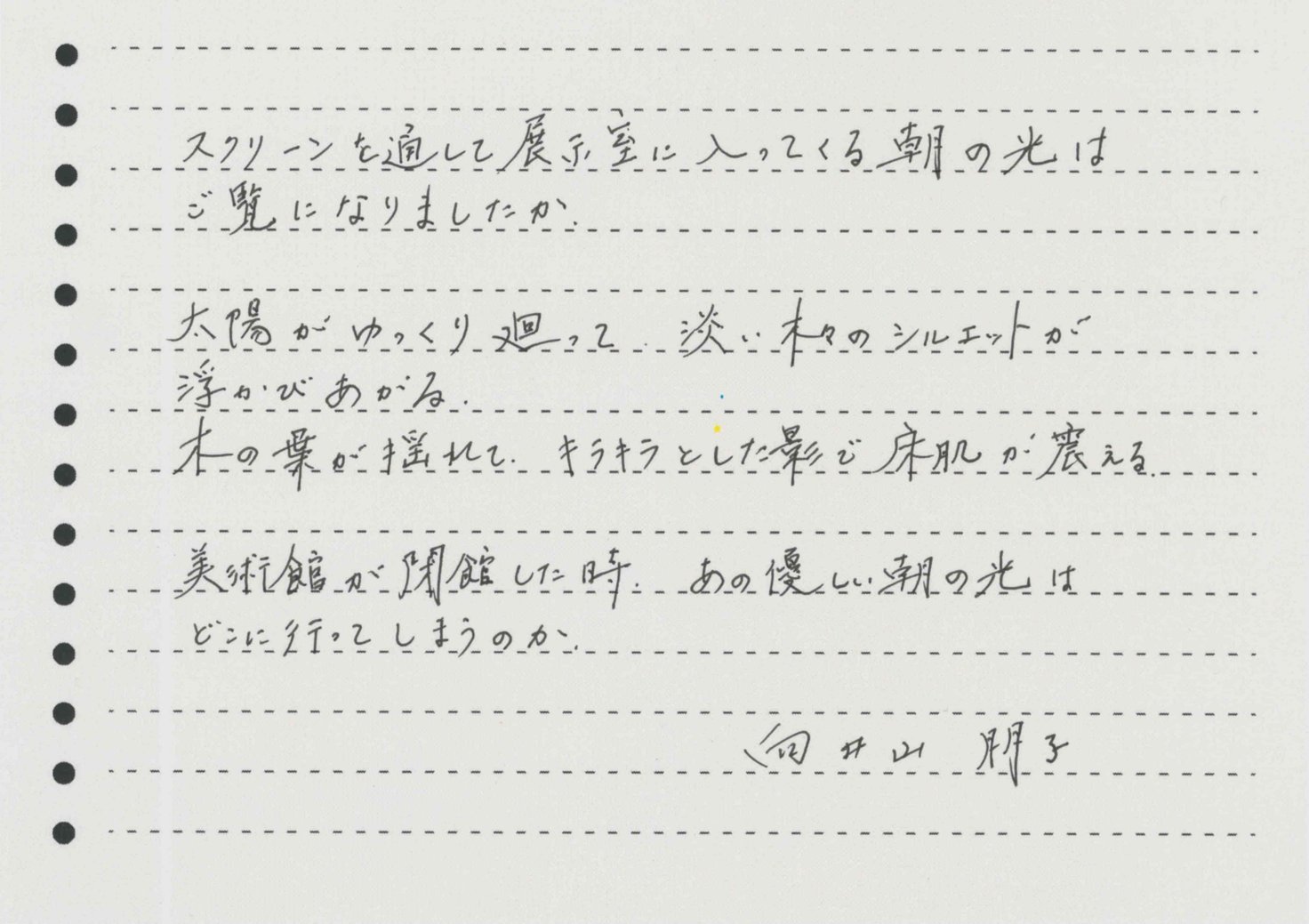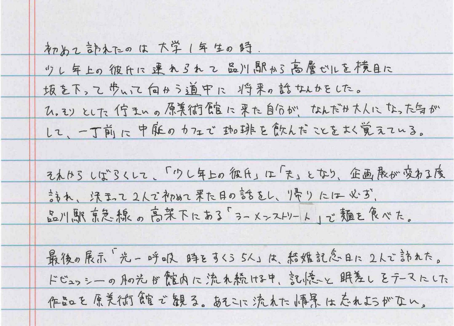 閉館する原美術館への想いは当然、人それぞれである。各々の眼差しから見てきた原美術館との思い出を、手紙と写真で辿る「私と原美術館」。メールやSNSなど情報の流れが早い今だからこそ時間をかけて丁寧に思い出と向き合うことは、事切れる原美術館との記憶を色濃く残すことになるのではないだろうか。