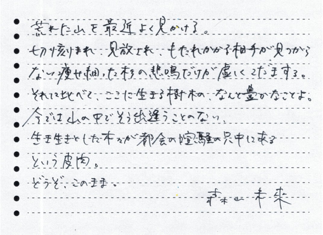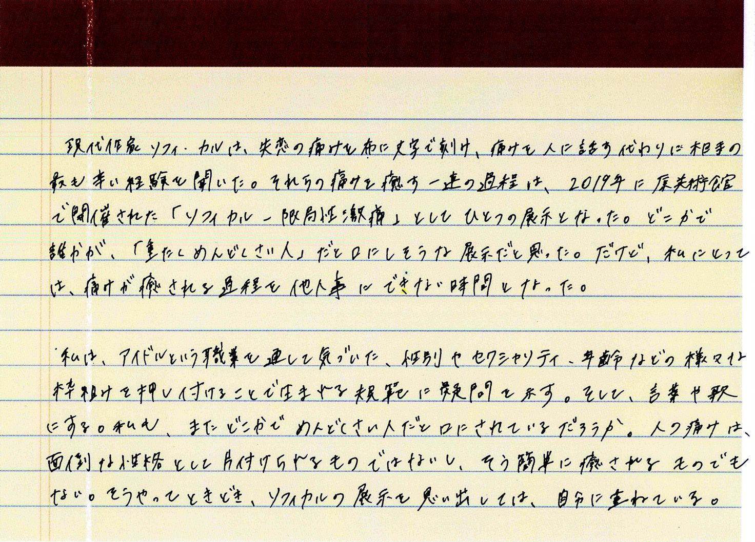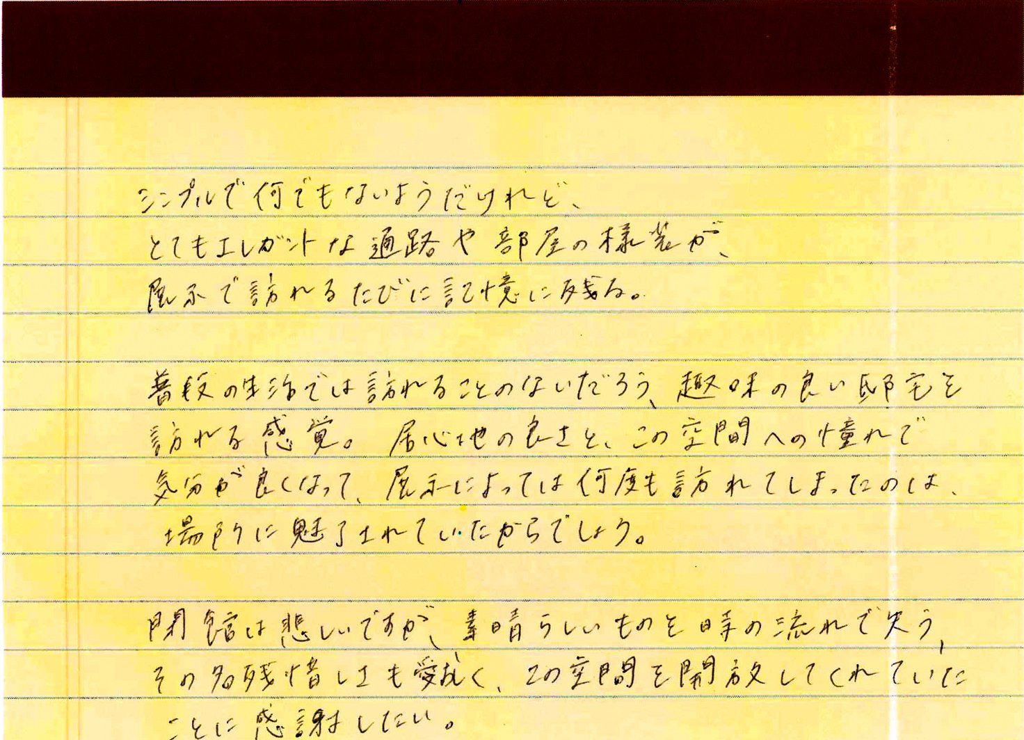 閉館する原美術館への想いは当然、人それぞれである。各々の眼差しから見てきた原美術館との思い出を、手紙と写真で辿る「私と原美術館」。メールやSNSなど情報の流れが早い今だからこそ時間をかけて丁寧に思い出と向き合うことは、事切れる原美術館との記憶を色濃く残すことになるのではないだろうか。