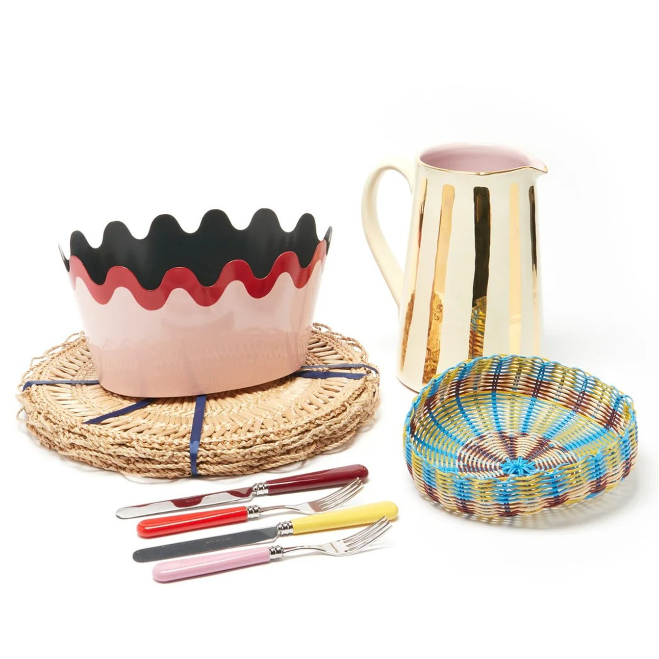 絵画のようなテーブルウェアを取りそろえる「マチルダ?ゴード(Matilda Goad)」から、便利なランチセットも。ホワイトセラミックジャグ、ピンクのスカラップメタルボウル、ブルー&イエローのバスケット、ラフィア製プレースマット、ナイフ&フォークと、これさえあれば一通りそろえられます。
