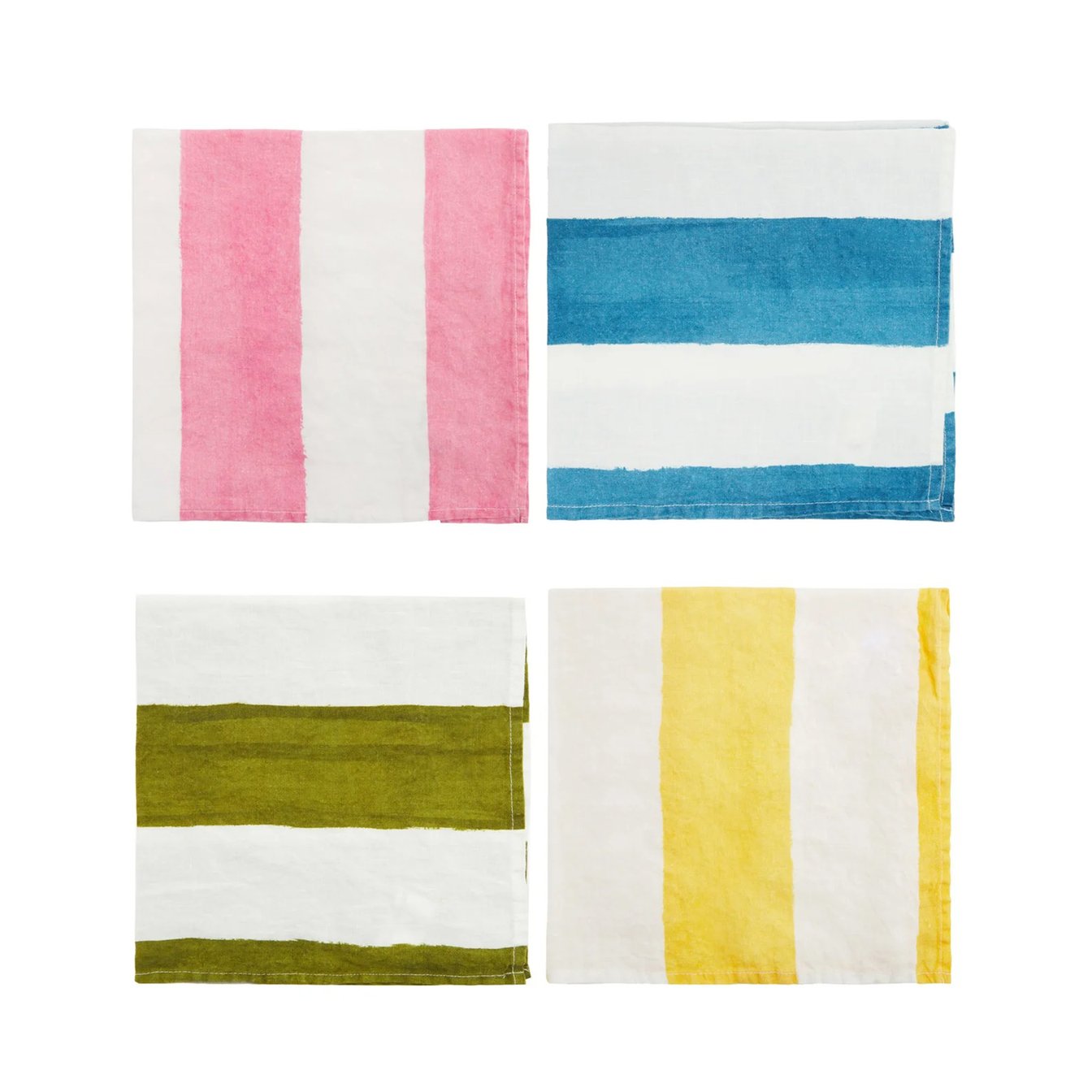 シンプルさの中に温かみがあるデザインが特徴の「サマリル&ビショップ(Summerill & Bishop)」のナプキン。手書き風の鮮やかなストライプ柄で、爽やかなテーブルセッティングに。ピンク、イエロー、ブルー、グリーンの4枚セットで、カトラリーとの組み合わせも楽しんで。