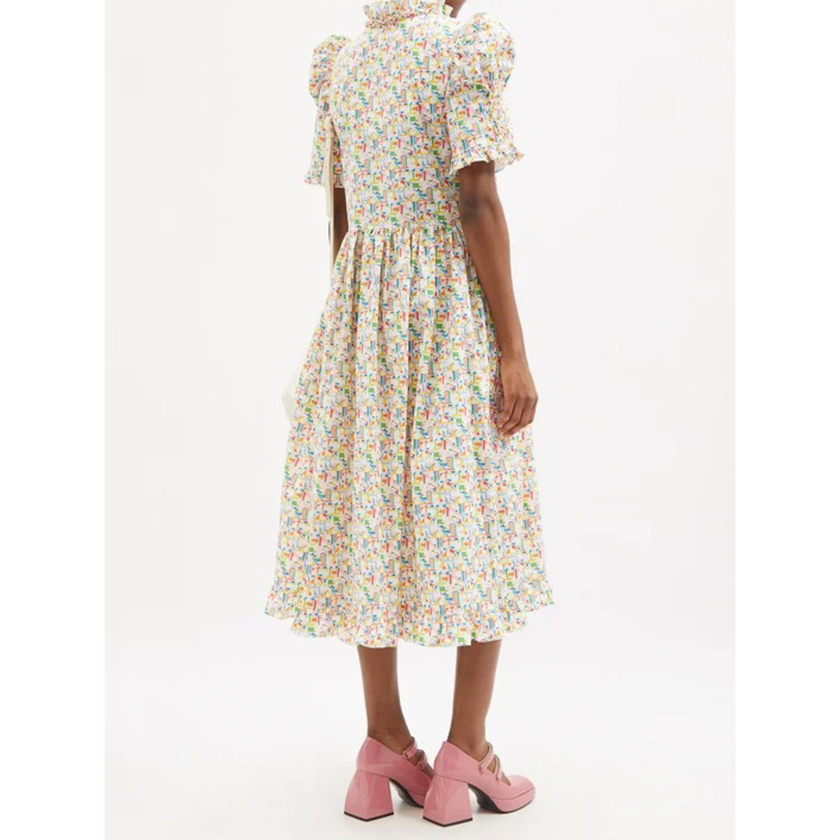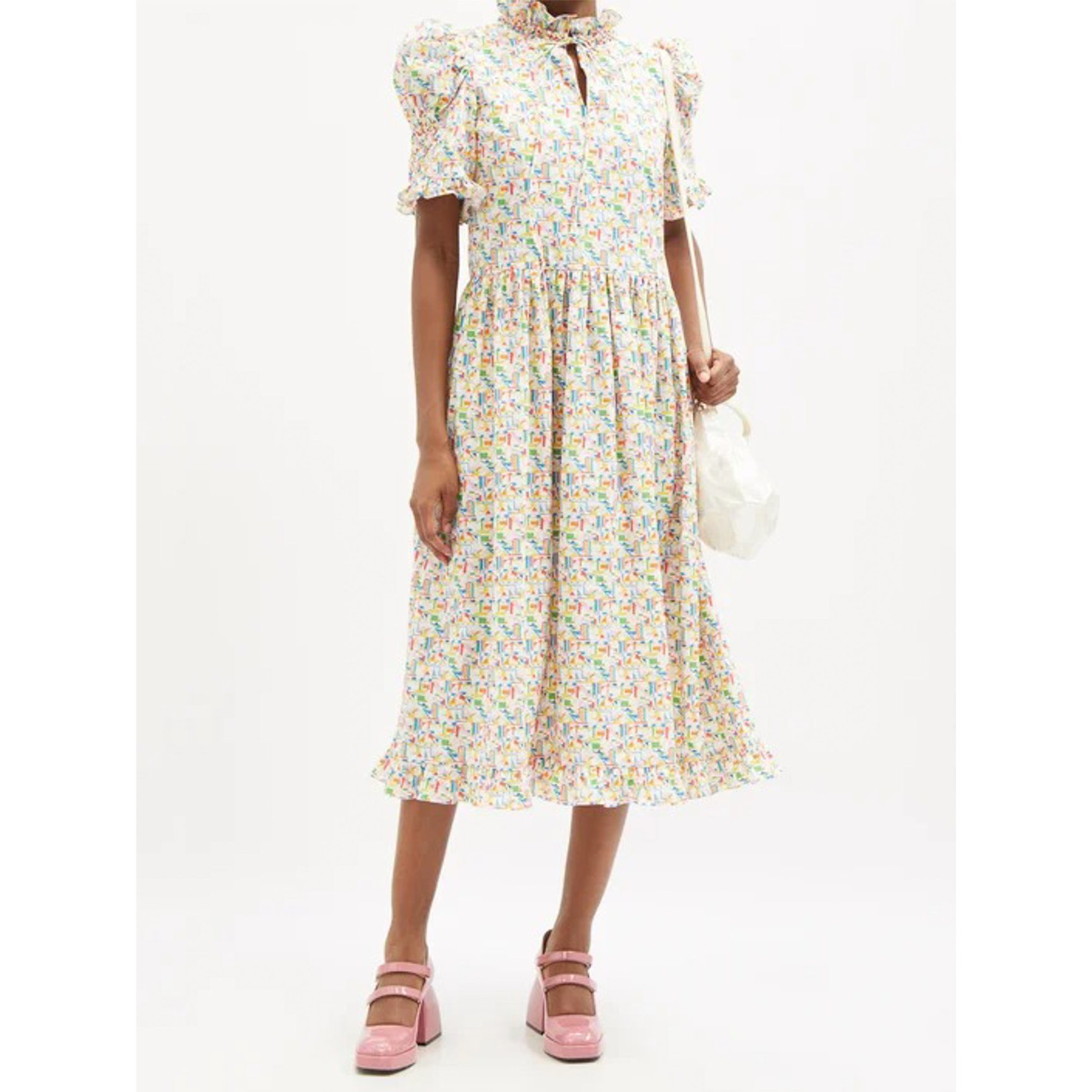 ハリのあるコットンポプリンにレトロなジオメトリックプリントをあしらい、シグネチャーのラッフル付きネックラインとパフスリーブで仕上げた「レアンドラ」ドレス。膝下の絶妙な丈感がよりエレガントに演出してくれる一着です。