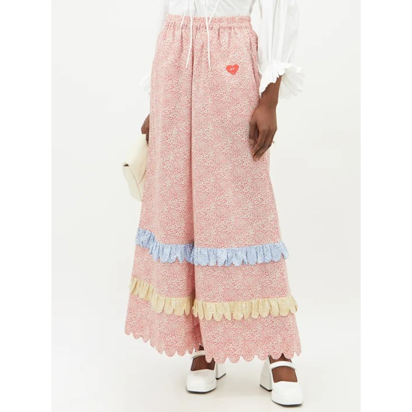 コットンポプリンパンツの「ルーク」は、波打つようなワイドレッグシルエットに、可憐なフローラルプリント、ハートロゴパッチ、パステルカラーのスカラップトリムをあしらった華やかな一本。ゴム仕様のウエストでストレスフリーな履き心地です。