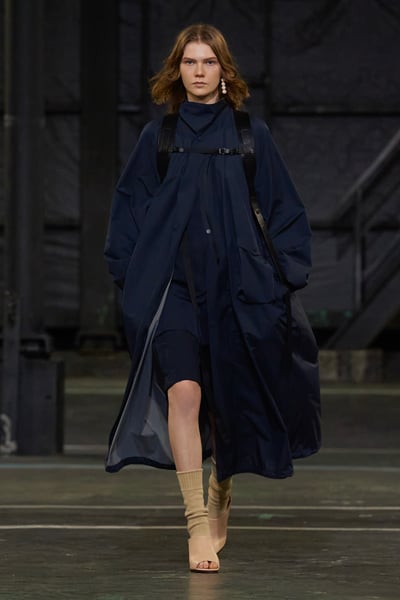 舞台は廃墟のような雰囲気のカートパーク。退廃的なフロアとは対照的な、白いボックス型のゲートからモデルが登場する。ファーストルックはネイビーのロングコート。1940年代の英国軍のデザートストームコートを参照したデザインで、素材は超軽量ナイロンのパーテックスを使用。大振りのバックパックを背負いながらも、風をはらんだテキスタイルがアクセントのグログランリボンと共になびき、ソックスと合わせたベージュのオープントウシューズが上品な印象に仕上げている。