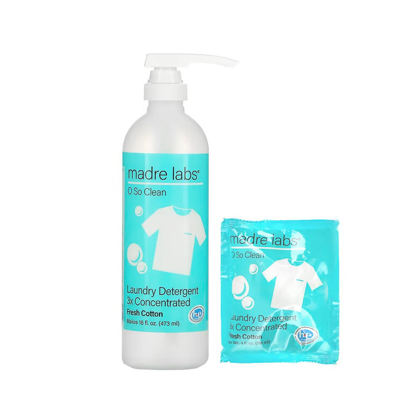 環境にも洗濯槽にもやさしい、ナチュラルな衣類用の洗剤をお探しなら「Madre Labs(マドレラブズ)」を試してみては?化学物質や人工的な強い香りでごまかさない、洗浄力も申し分なしのアイテムは、洗濯物の量に合わせポンプのプッシュ回数を決められるので、入れすぎも防げます。パウチは3倍濃縮なのでボトルに入れて水で薄めて使います。
