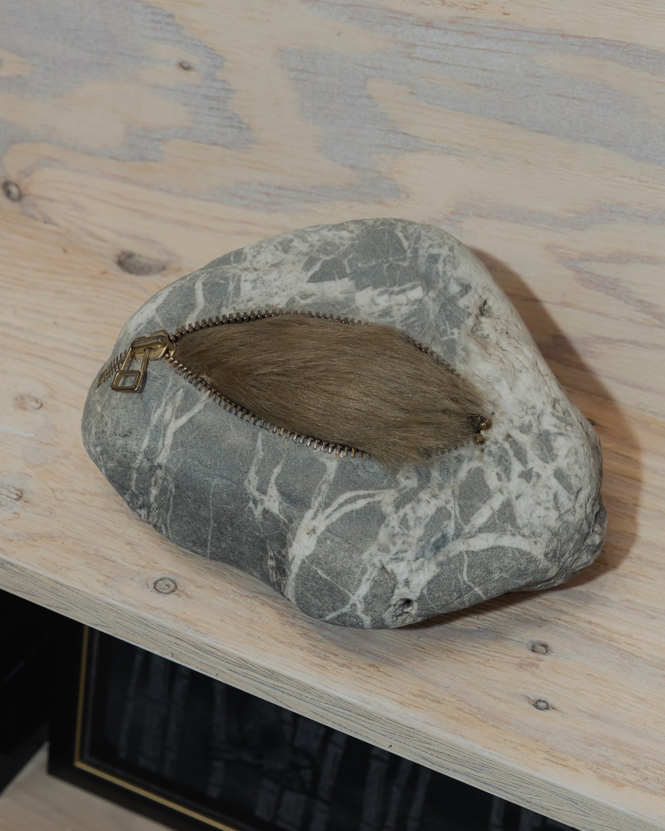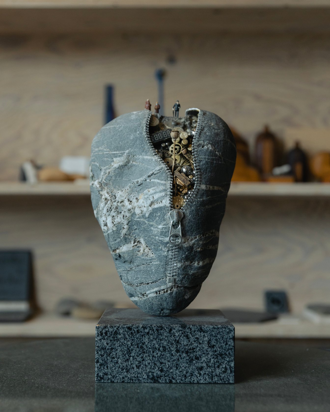 人と同じで、それぞれが違う人生を送っていることが石の形をみて知れることが楽しんです。「ほうほう、そうかい、そうかい」と勝手に石の話を聞いているんです。「ここをいじられるとあんたは嫌だよね」とかね(笑)。石の物語の話と、作品にファスナーをつけたことも少し関連があって、「石のファスナーを上げる」と言う動作で、中か違う物語を紡ごうかなと思ったんです。「作品になったらそれでおしまい」ではなく、石の物語をさらに蓄積させるイメージですね。