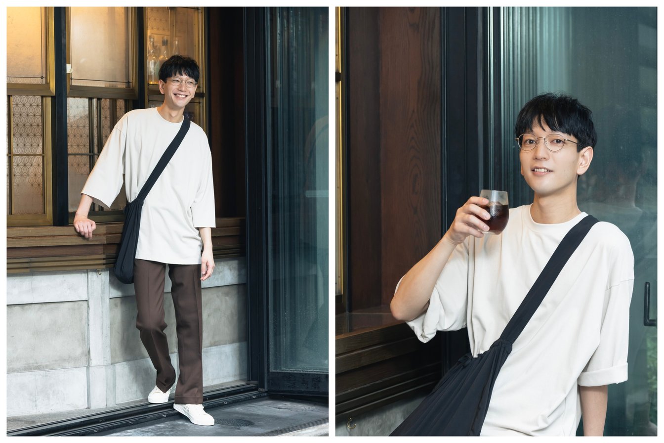 ブラウンカラーで統一された70'sを思わせるポリエステル素材のスラックスと、現代的なオーバーサイズカットソーを取り入れた遊び心のあるスタイリングは、JINSが独自に提案する形の多角形フレーム「ペグトップ」とベストマッチ。カジュアルなスタイリングとメガネの親しみやすく優しい印象が相まってリラックスしたムードが漂うこと間違いなし。ちなみにTEPPEIさん曰く、肉厚な生地感とドロップショルダースリーブが特徴的なオーバーサイズカットソーは「今やメンズファッションの定番と言っても過言ではないし、一枚着るだけで様になりやすい」とのこと。今すぐ取り入れやすいオーバーサイズカットソーとペグトップメガネで大人のリラックス感を目指してみては?