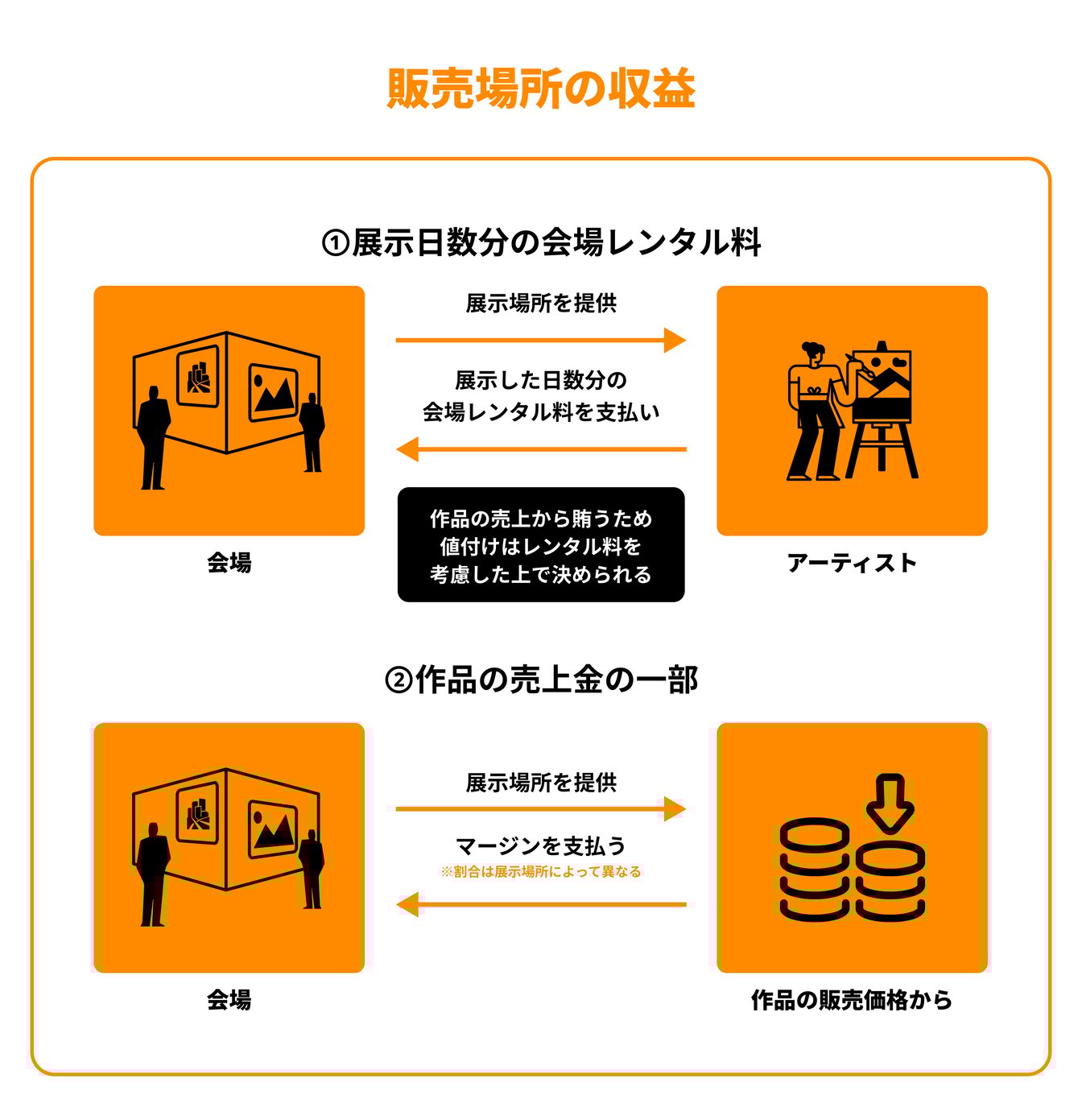 作品はギャラリーや百貨店のほか、近年はセレクトショップやカフェなどでも販売されることが増えた。このように作品の展示会会場となる場所が収益を得る方法は、会場レンタル料を請求する場合と、作品の販売価格の何割かをマージンとして会場に支払う場合の2通りがある。