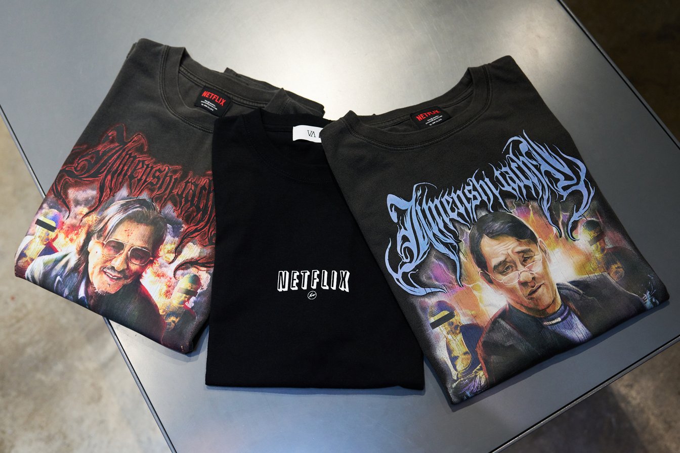 Netflix社がオリジナル作品の世界観をデジタルだけでなくフィジカルで体験できるプロジェクトを模索しているという話をお聞きし、お会いしたら、プロダクトのディレクターが偶然知り合いだったということもあるのですが、なにより波長が合いました。最初は、「極悪女王」の舞台でもある後楽園ホールでライブグッズを売るお店のようなものを出して、その後「地面師たち」のTシャツを作りました。