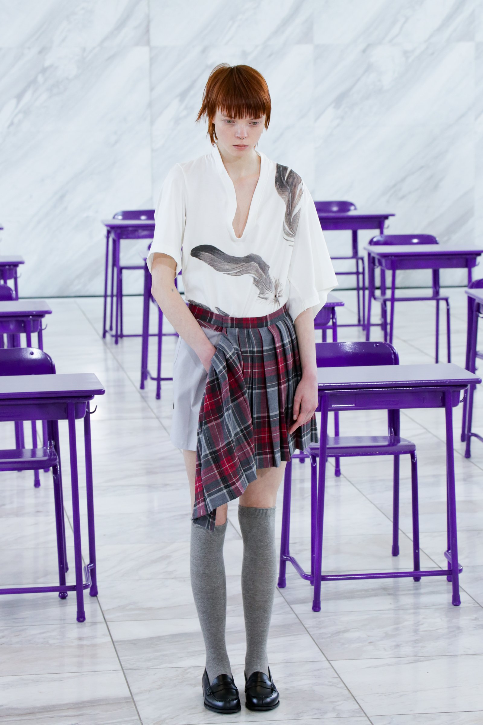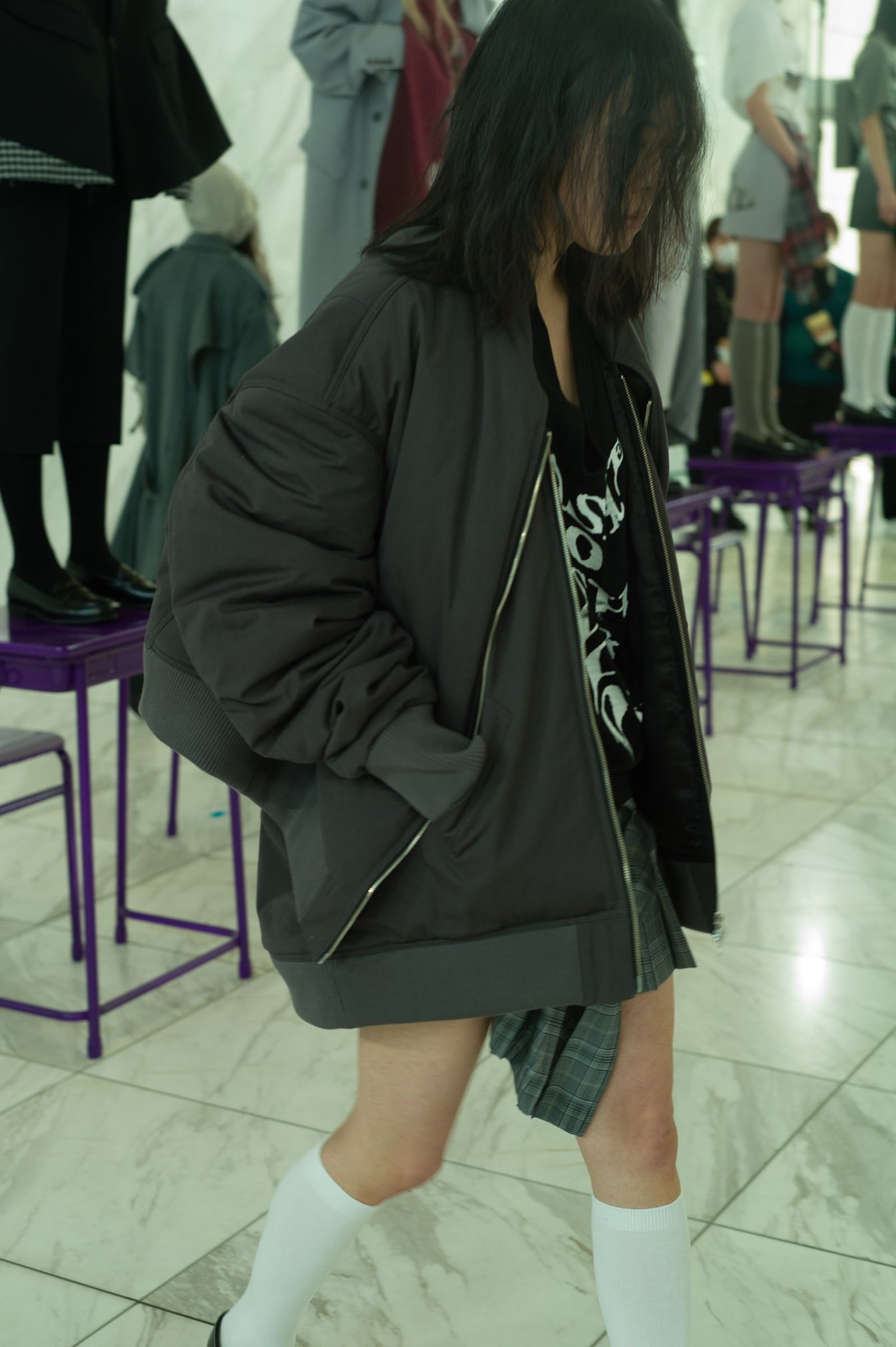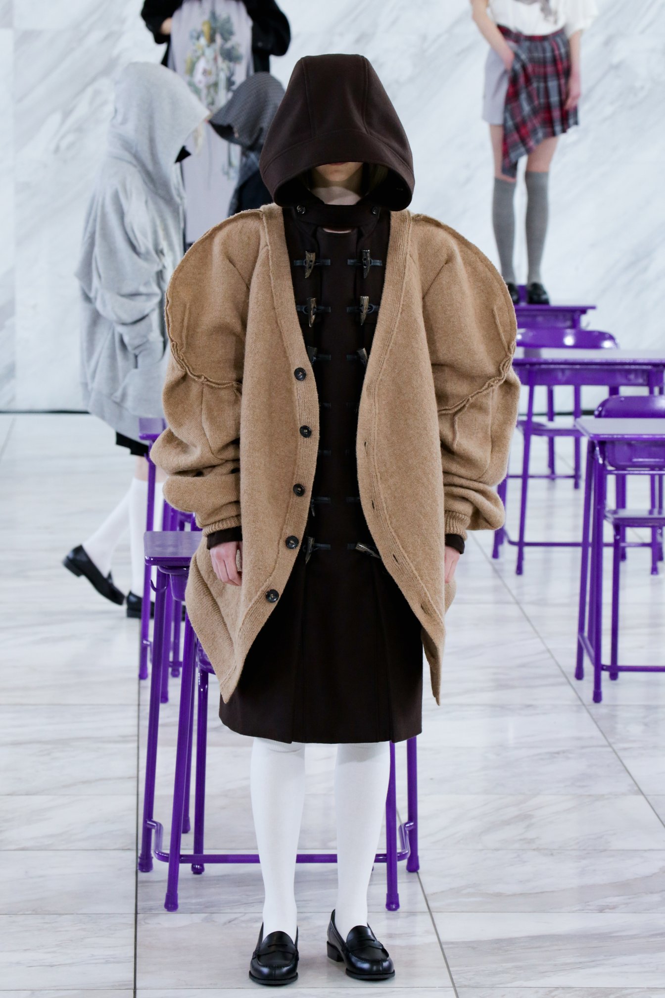 ショー全体を通して浮かび上がるのは「学生っぽさ」。教室のような会場に登場したのは、チェック柄のプリーツスカートやハイソックス、ローファー、パーカ、ベージュカーディガンなど学生服を彷彿とさせるアイテムの数々だ。