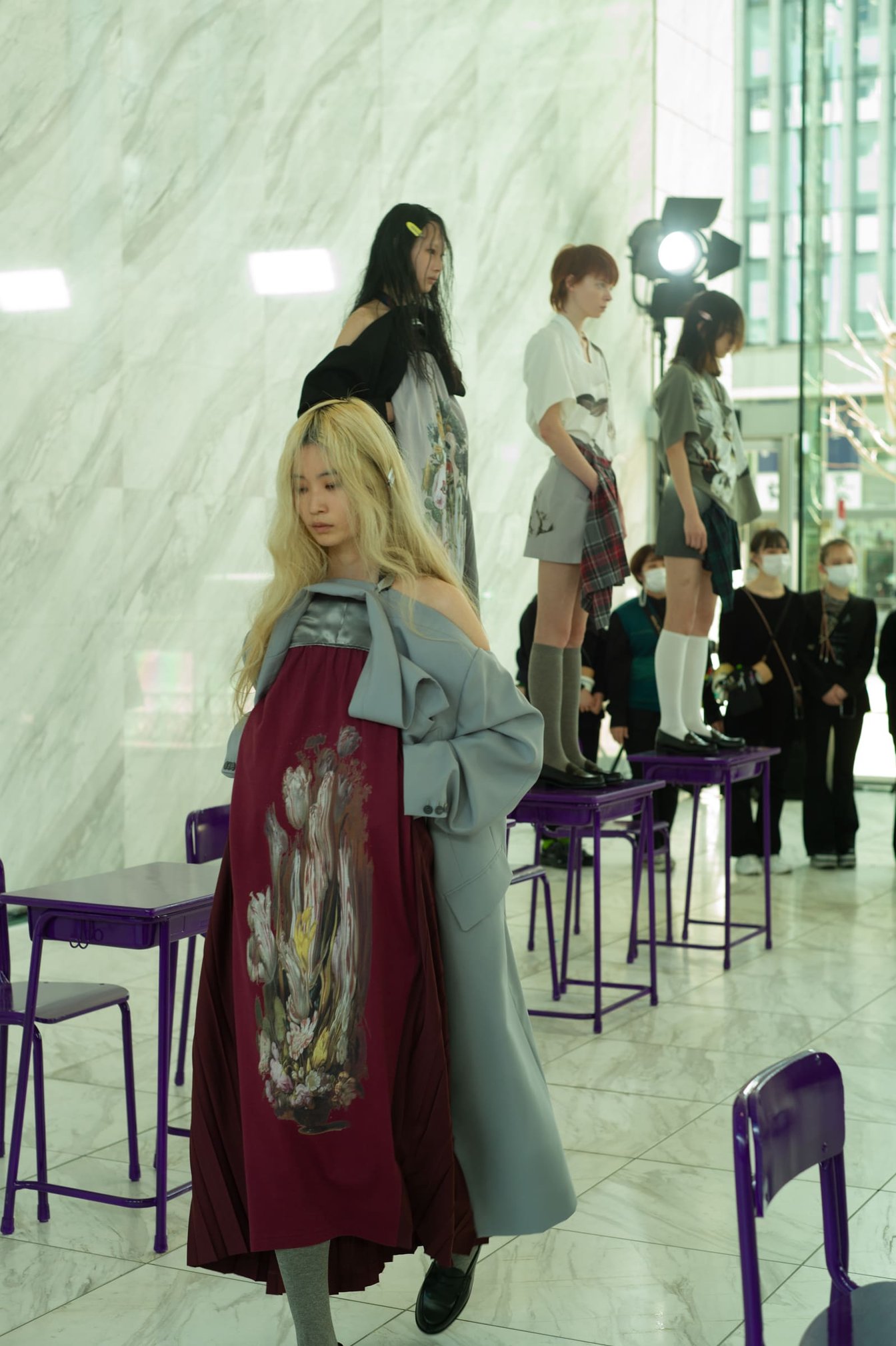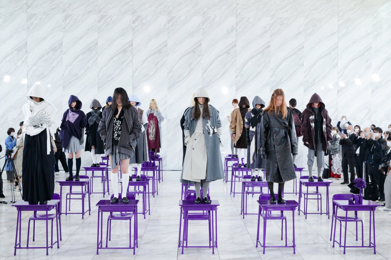 デザイナー 吉田圭佑が手掛ける「ケイスケヨシダ(KEISUKEYOSHIDA)」が3月15日、「Rakuten Fashion Week TOKYO 2021 A/W」で2021年秋冬コレクションを発表した。自然光が差し込むワールド青山の会場には、紫にペイントされた机と椅子が並ぶ教室のような空間が出現。デビューから6年を迎えた今季、立ち上げ当初から掲げる「思春期」というテーマに、改めて向き合ったコレクションとなった。