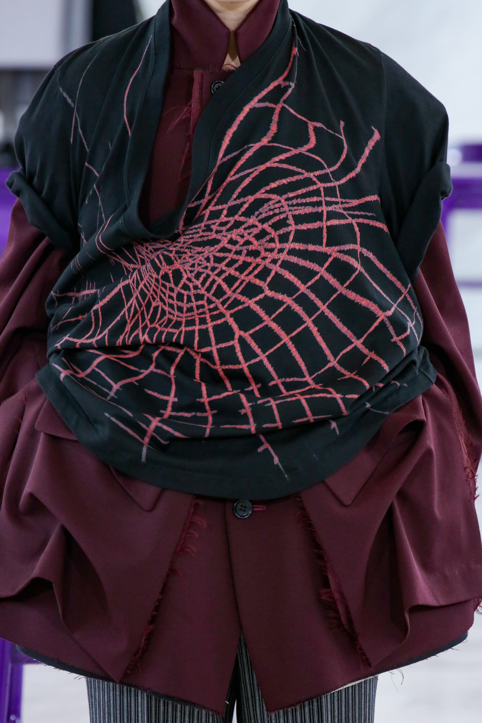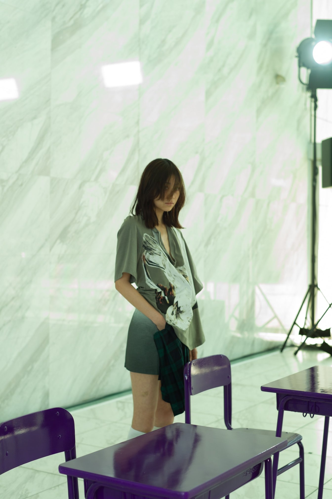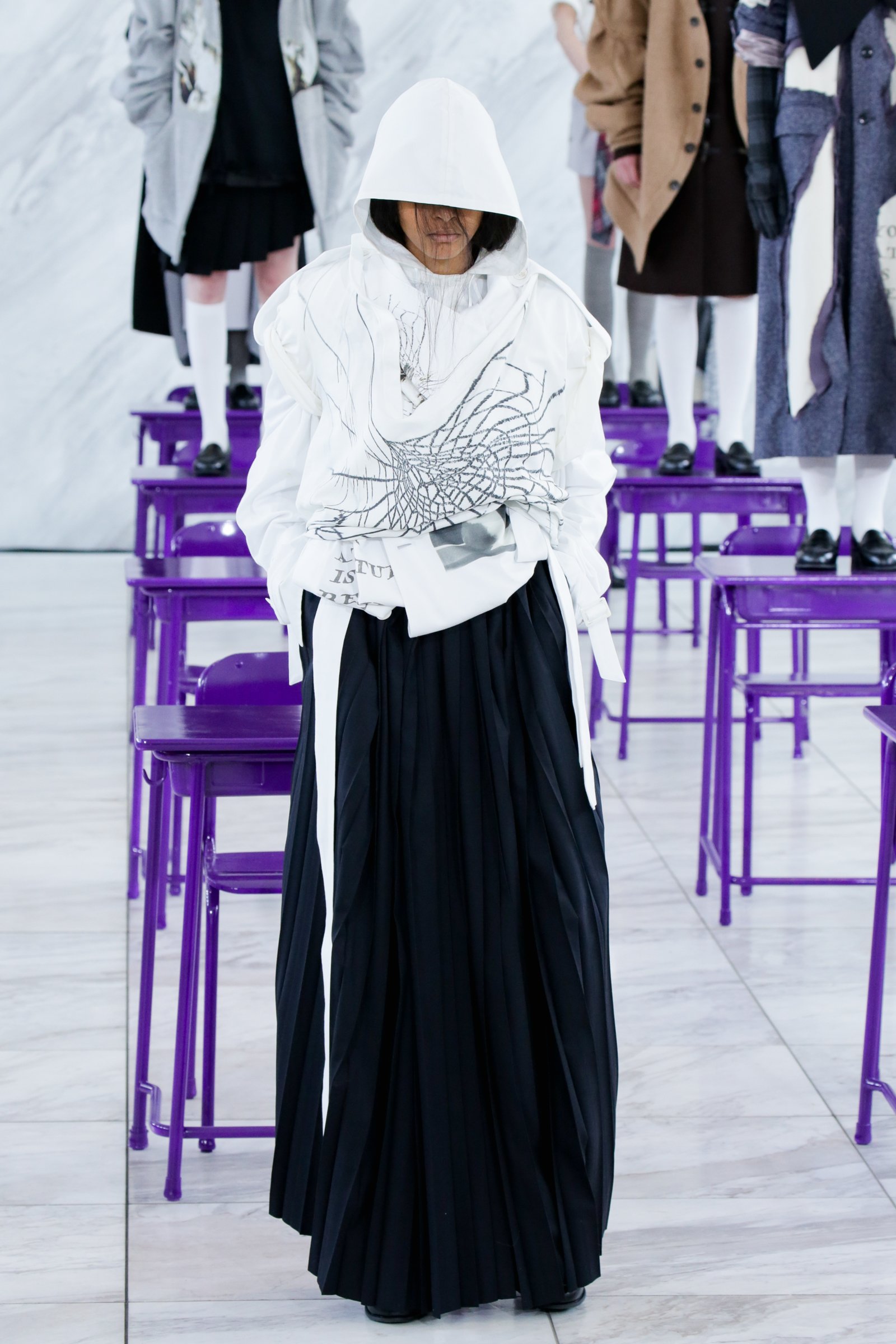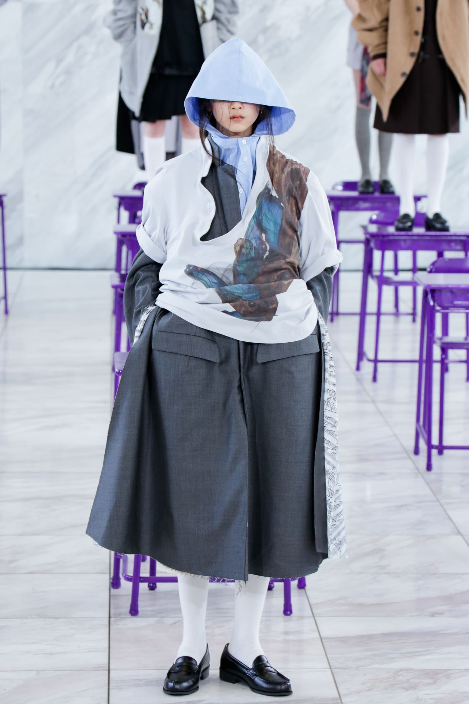紫に塗られた教室、ベートーヴェンのピアノソナタ「月光」のBGM、俯くような姿勢のモデル......と演出からは思春期の鬱々としたムードも感じられるが、根底にはデザイナーのポジティブな考えが潜んでいる。「いつも以上の過密なスケジュールによる追い込まれていく感じ、そして(社会全体的に)先が見えない現在の状況に、冴えなかった自分の学生時代に若干重なる部分があった。僕はファッションに興味を持ち明るくなっていった過去があるため、『冴えない姿』そのものが、これから前向きになっていく希望のメタファーとして使えるのではないか、と」。デビューから6年目にして、ブランド立ち上げ当初に強く打ち出していた「思春期」や「冴えない学生」っぽさを改めてフィーチャーしたコレクションとなっている。