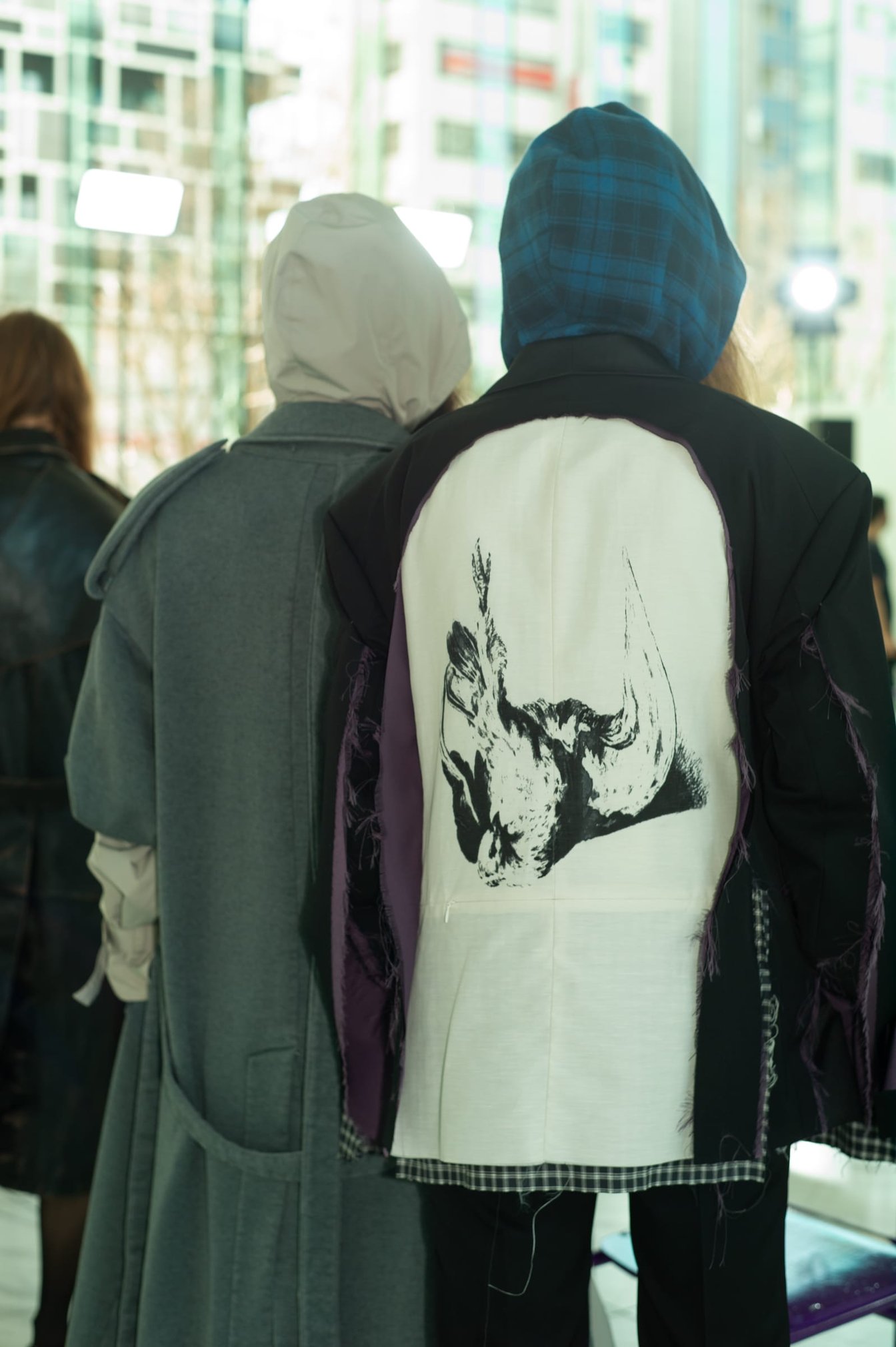 また、今季表現したのは、思春期を生きる若者の「装い」ではなく「佇まい」だといい、2枚重ねのブルゾン、そして背中部分にカットが入り身体を通すことでドレスのように着られるロング丈のジャケット(普通のジャケットとして羽織ることも可能)といったアイテムが、「うつむく」シェイプを作り出す。