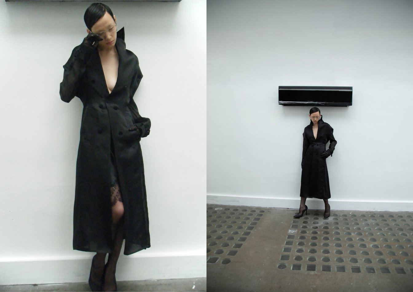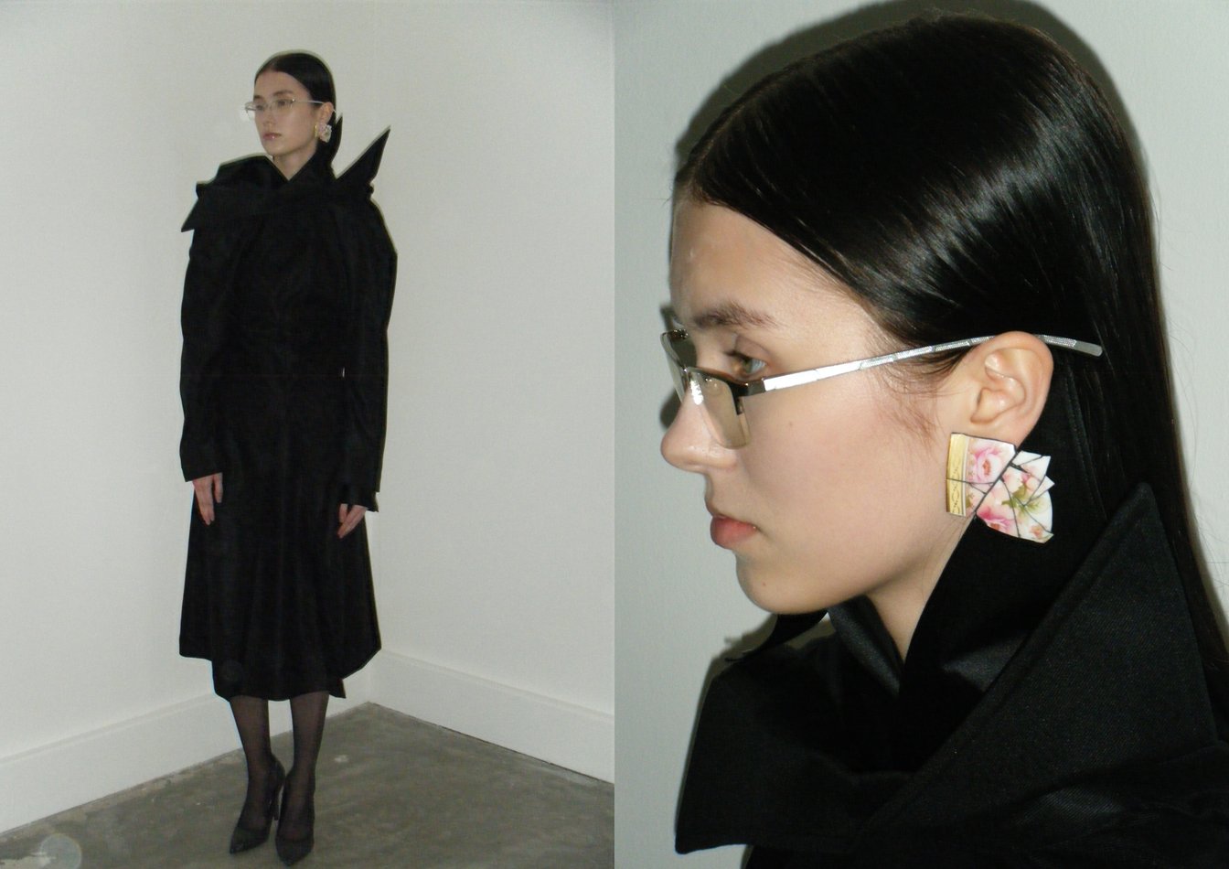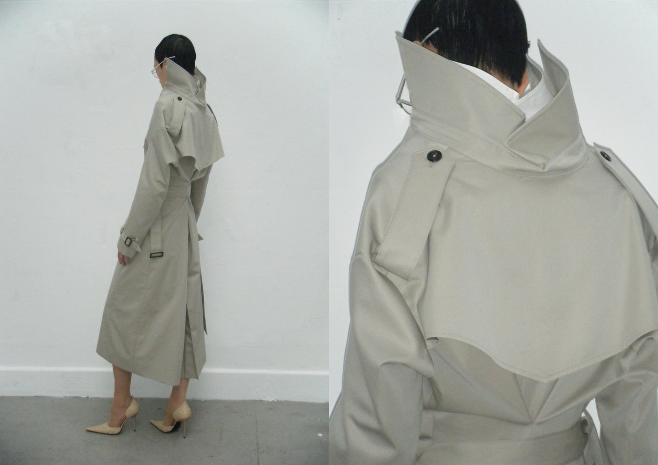 今シーズン数多く登場する、ボディに着せつけたジャケットやコートの後ろ襟を立て、折り紙のように畳んだディテールや、内側に畳み込まれた前身頃は、首元やウエスト、肩周りの引き皺を生み出す。折り込まれたことで巾を失ったフロントを無理やり止めることで発現する皺は通常であれば美しくないとされているが、幸せと不安、厳格さとだらしなさ、冷たさと暖かさのように、装いの中で相反しながらも朧げでまろやかに混ざり合う要素として重要な役割を果たしている。一際目を引くベビーピンクも、単純な可愛らしさではなく、グレーがかったくすみを感じさせるのも意図的だろう。