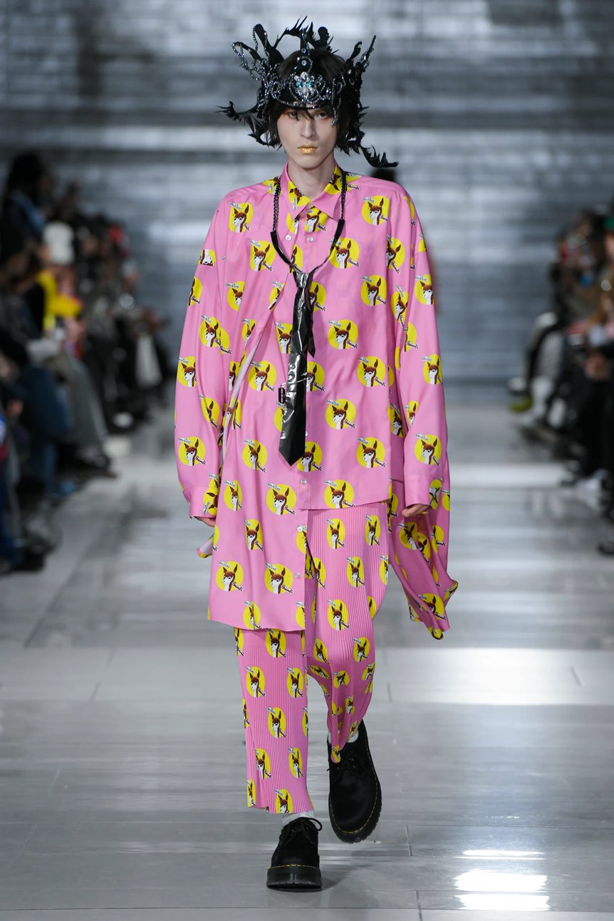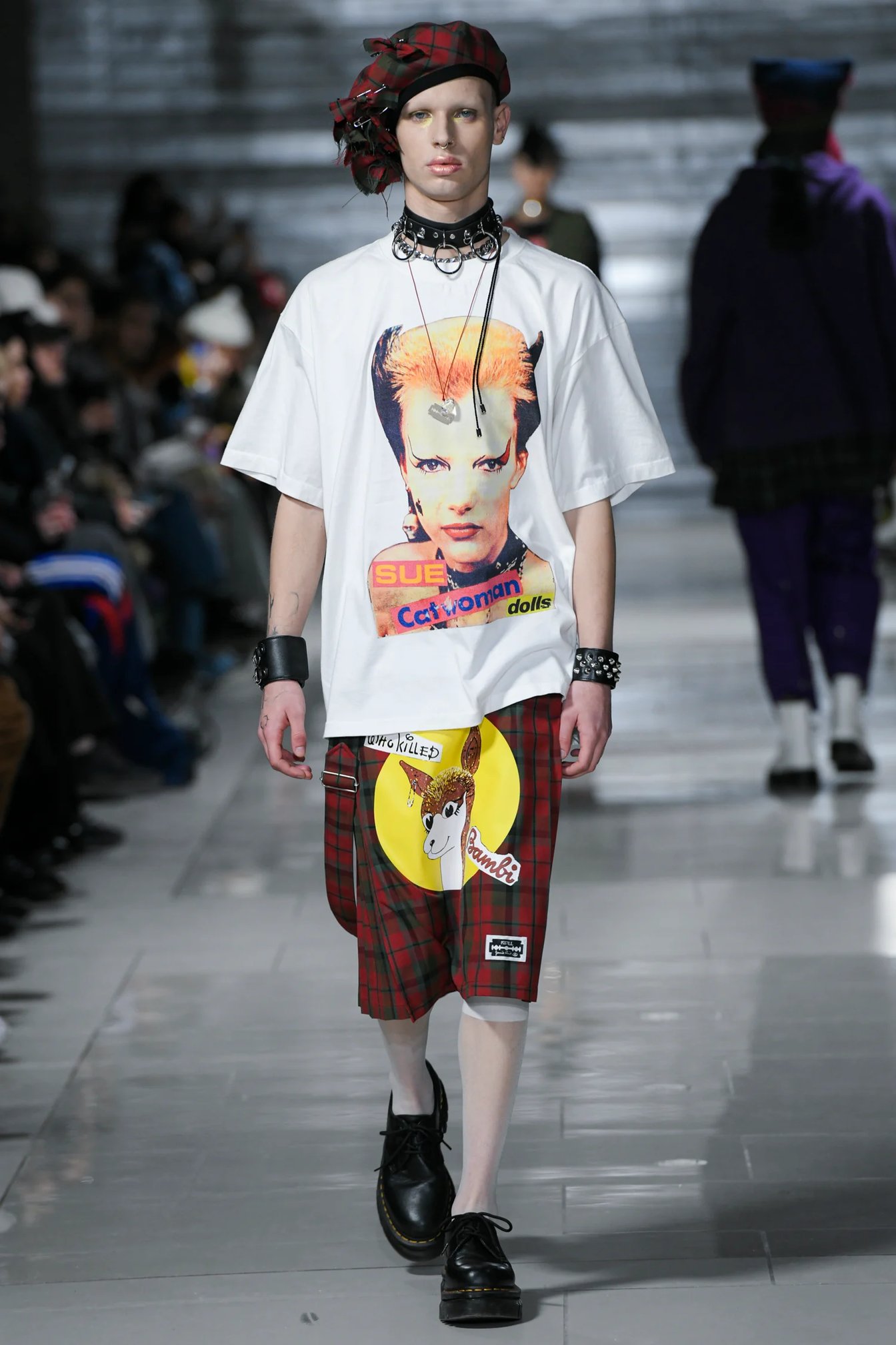 パリコレデビューとなった鈴木武蔵マーリンがモデルを務めたファーストルックのセットアップを中心に、異なるカラーやサイズで散見された鹿のグラフィック。これは、セックス?ピストルズのラストシングル「Who Killed Bambi」(1979年)のアートワークで、バンドとリードの最期を重ねながら“Punk never dies”という想いを込めたオマージュだ。「私は私らしいやり方で哀悼の意を込めたい。それは、『彼らは永遠である』という宣言でもある」(末安デザイナー)。