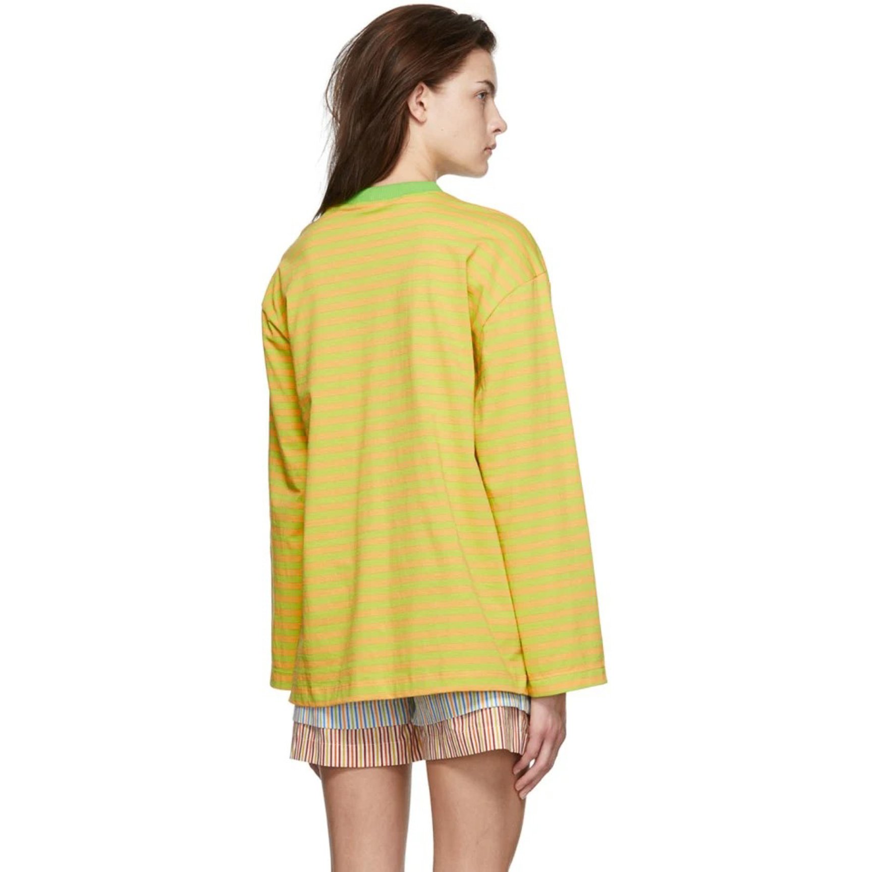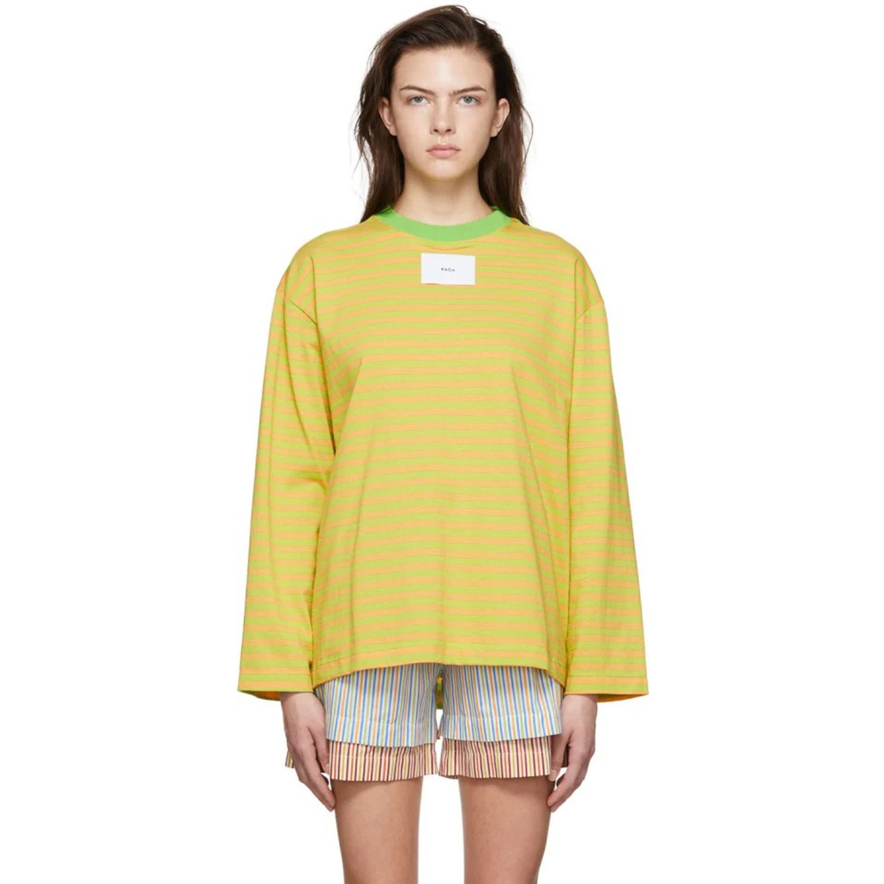 イエローとオレンジのボーダー柄に差し色のグリーンが映えるフレッシュなカラーパレットのトップスは、着こなしのアクセントに取り入れたいデザイン。アクティブに動く日に取り入れたい、着るだけで元気になるロンTです。