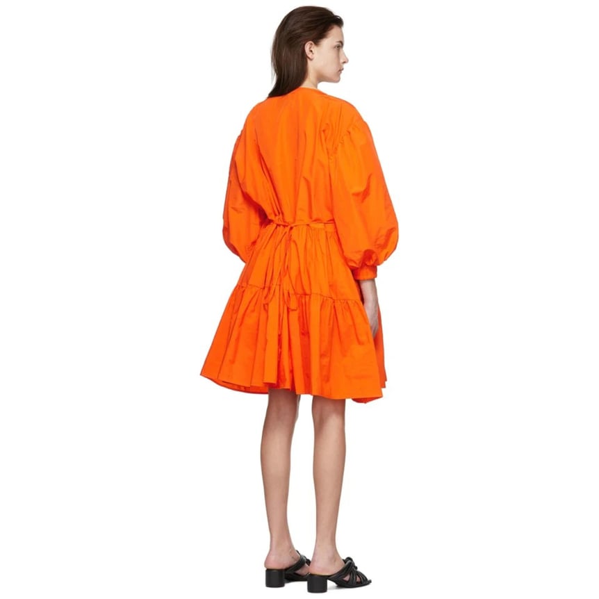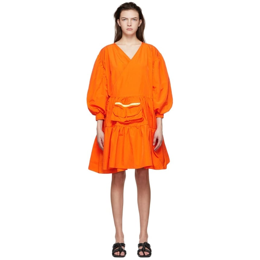 鮮やかなオレンジカラーが日差しに映える、ふんわりとしたシルエットのドレス。ハリのあるナイロンキャンバス地で作られたこちらは脱ぎ着がしやすいラップ仕様になっており、マチのあるポケットもついているので機能性抜群です。