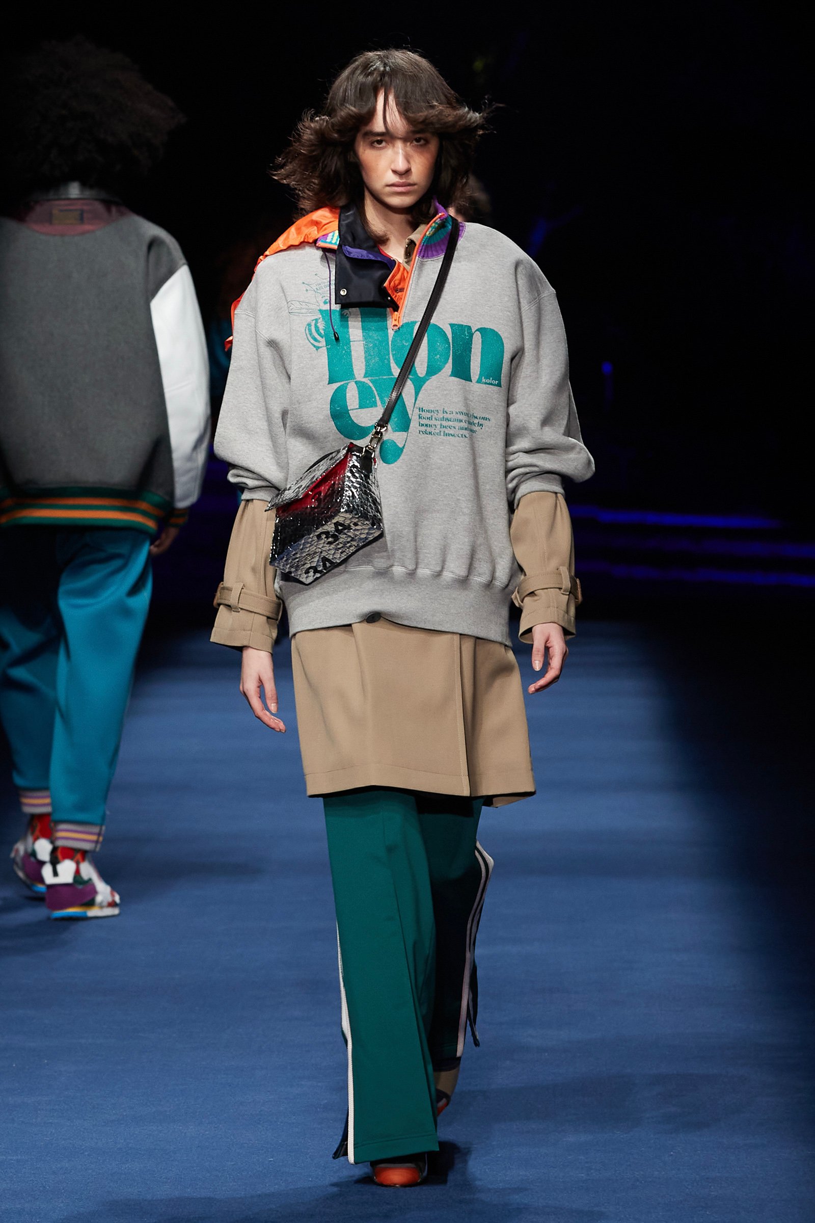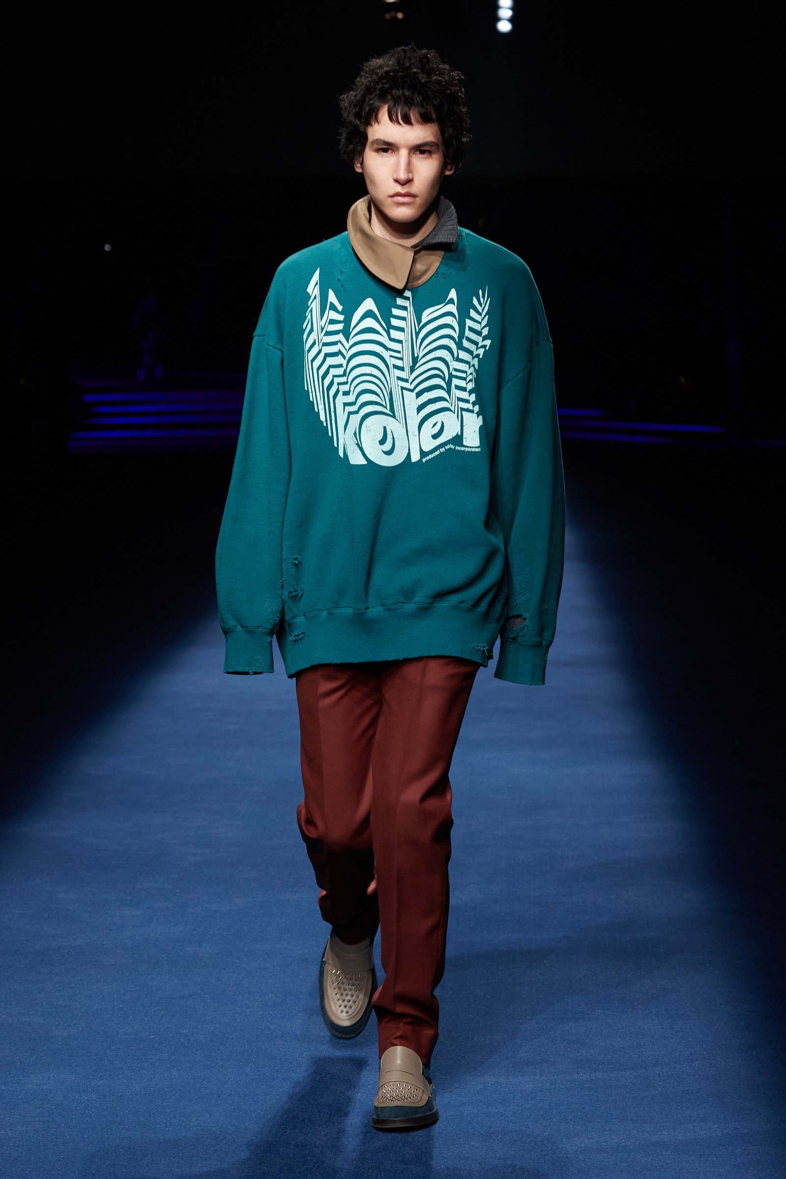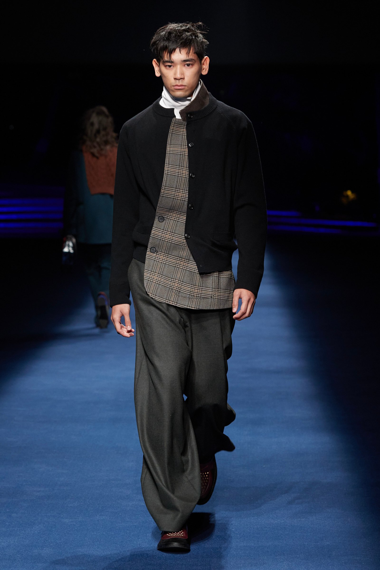 ランウェイは屋外とつながった構造で、青く照らされた庭園からモデルが登場する演出。2021年秋冬のメンズとウィメンズをミックスしたコレクションとなった。